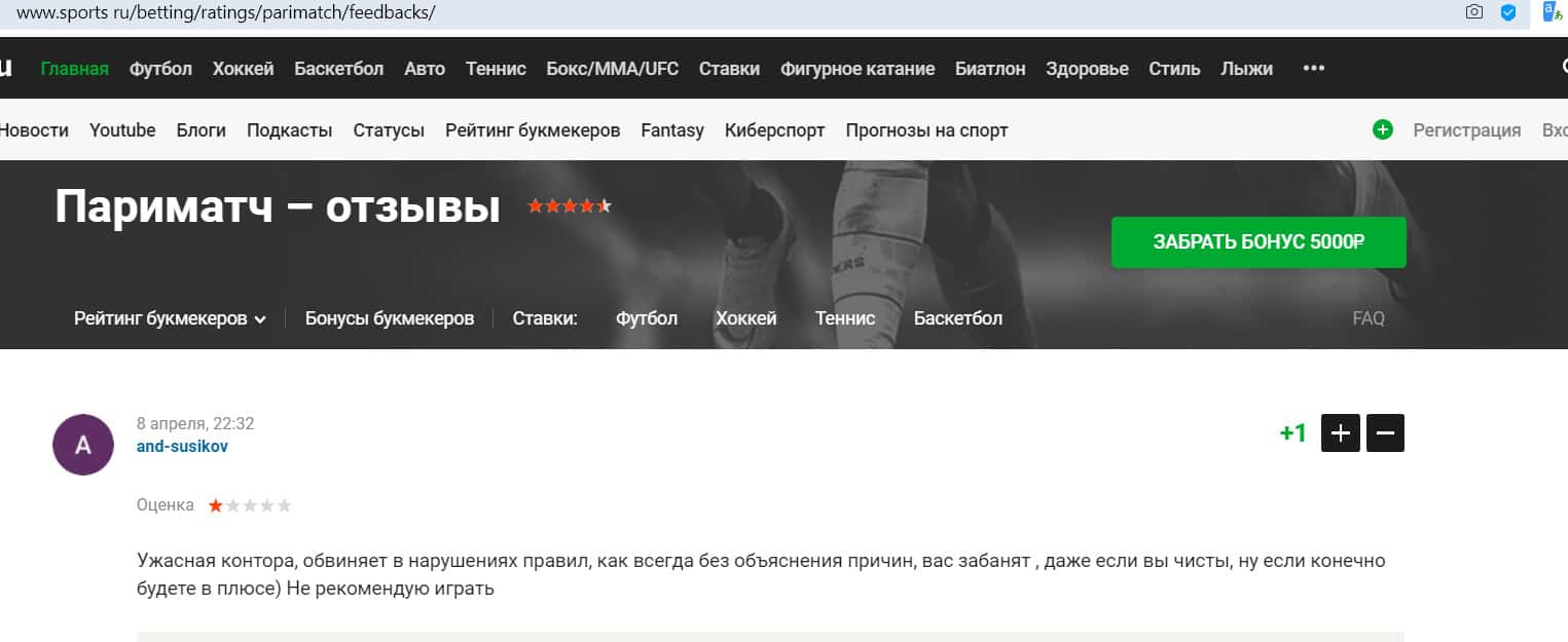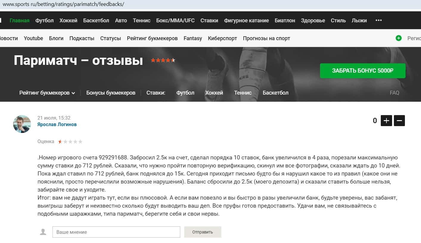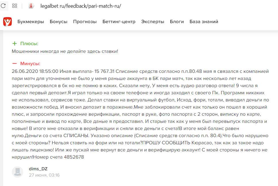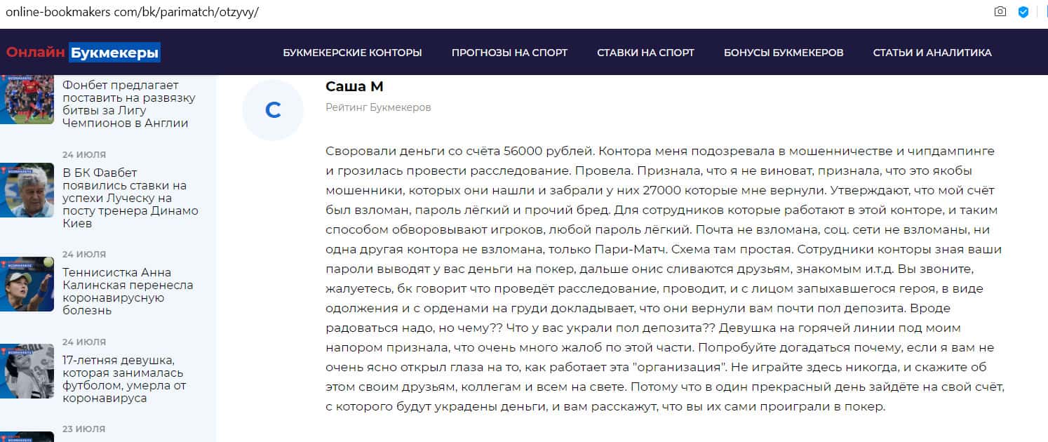 Саша написал подробный отзыв о том, как у него украли крупную сумму на сайте Пари Матч. Под его напором провели расследование и вернули половину. Ясно, что это дело их рук.