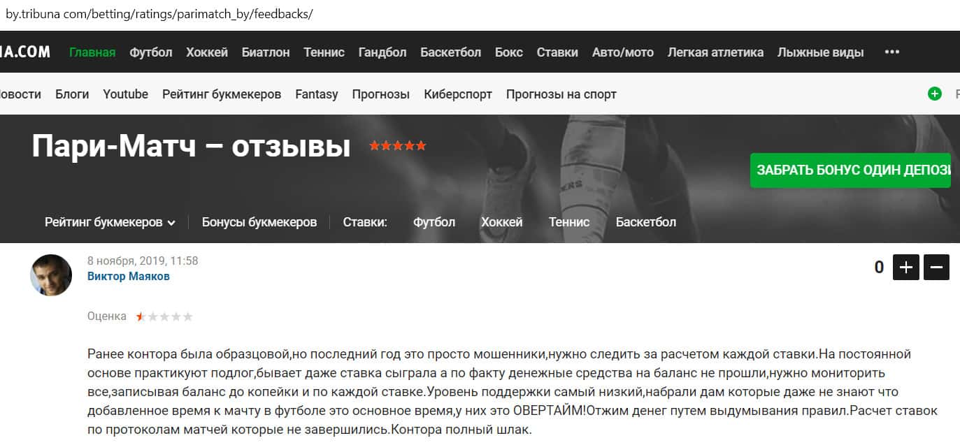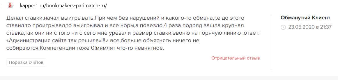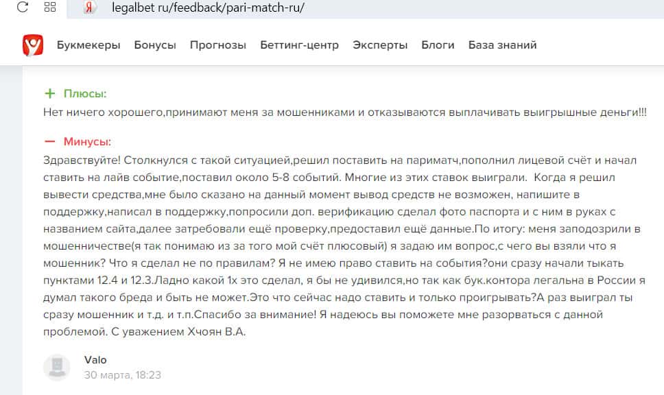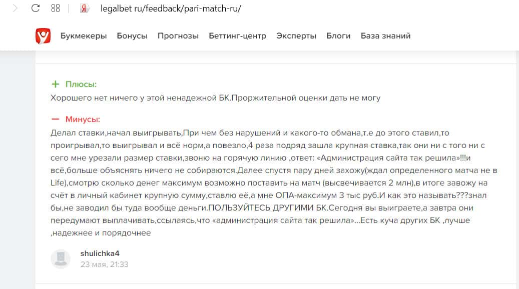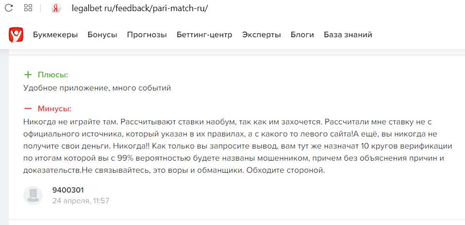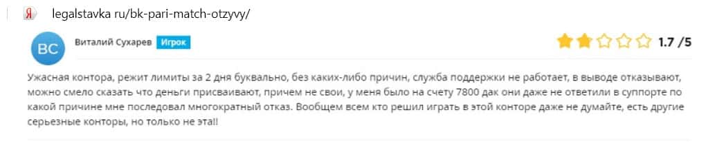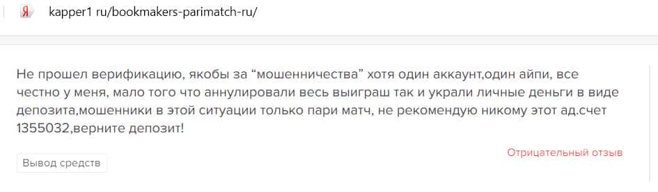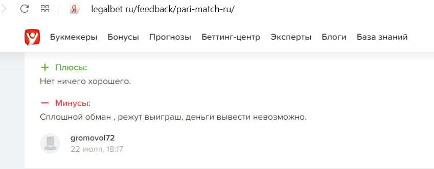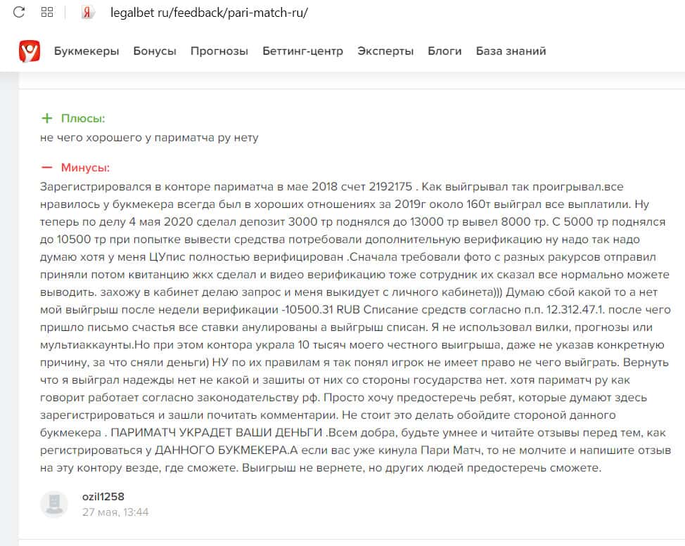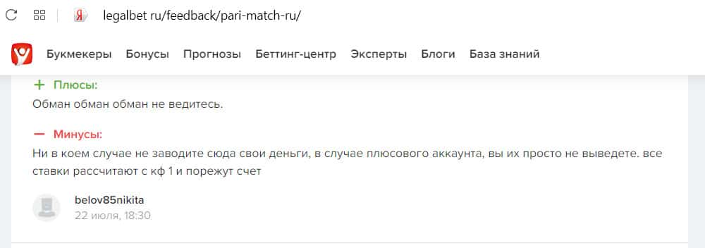 Еще один отзыв от возмущенного пользователя площадки Пари Матч говорит о том, что здесь сплошной обман, ставки режут, средства вывести невозможно.