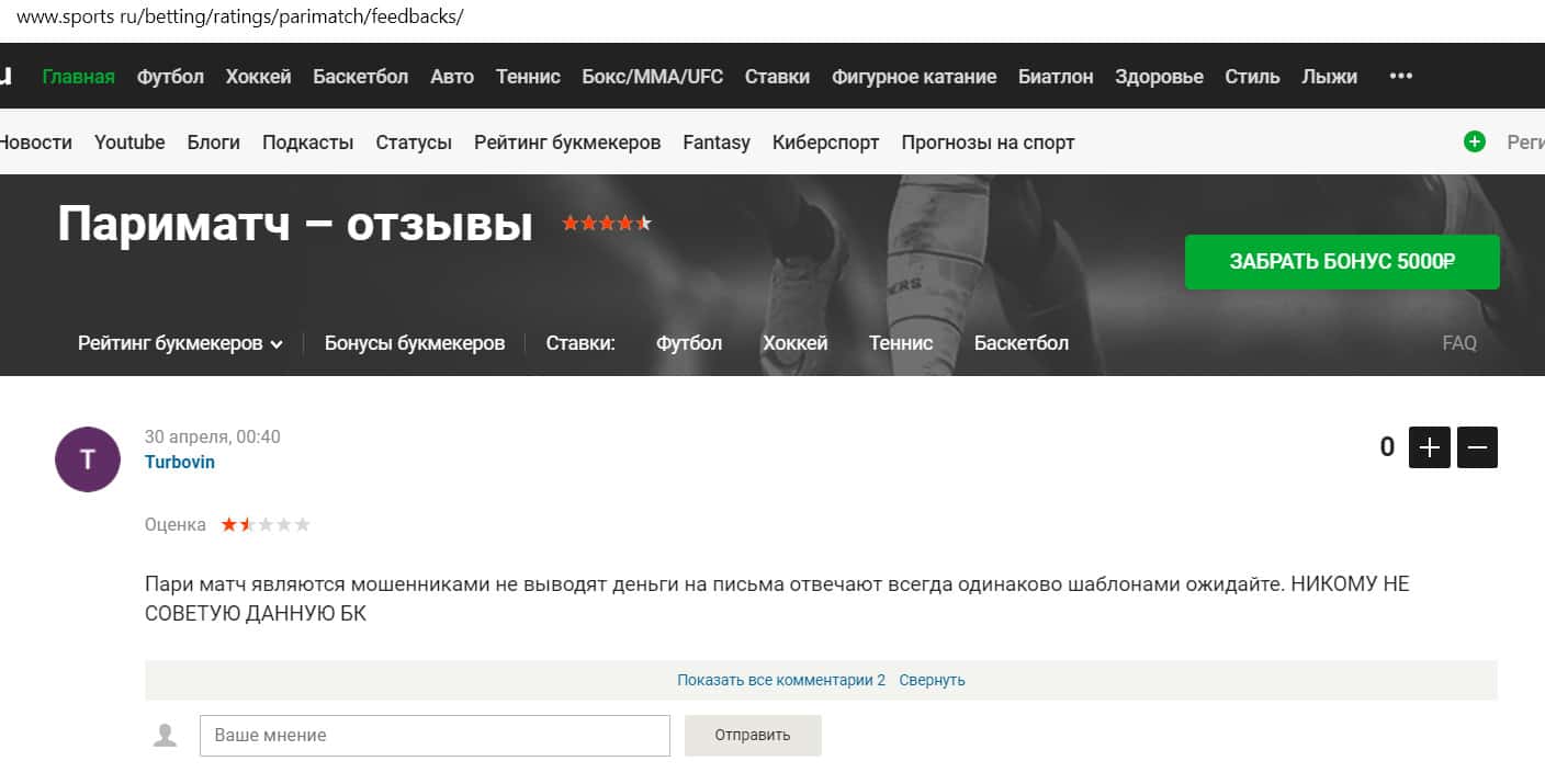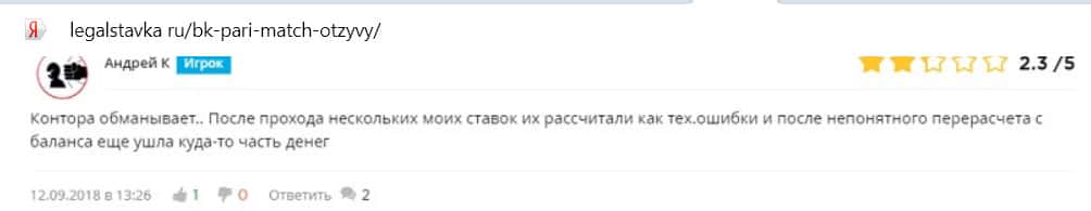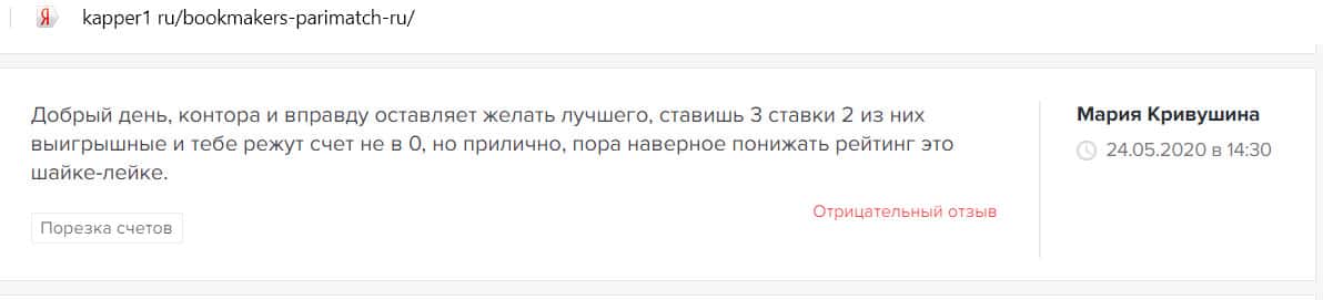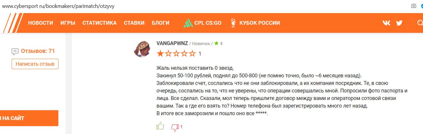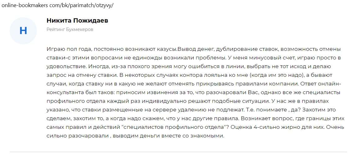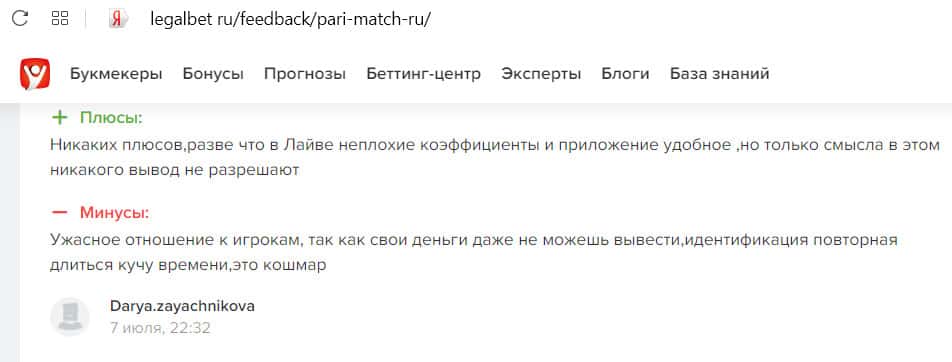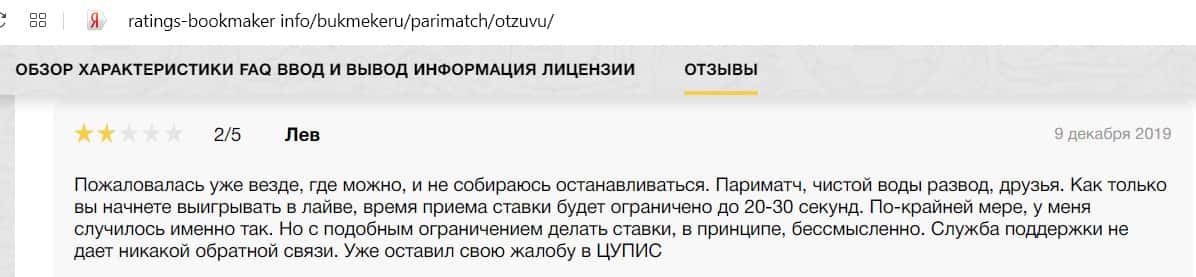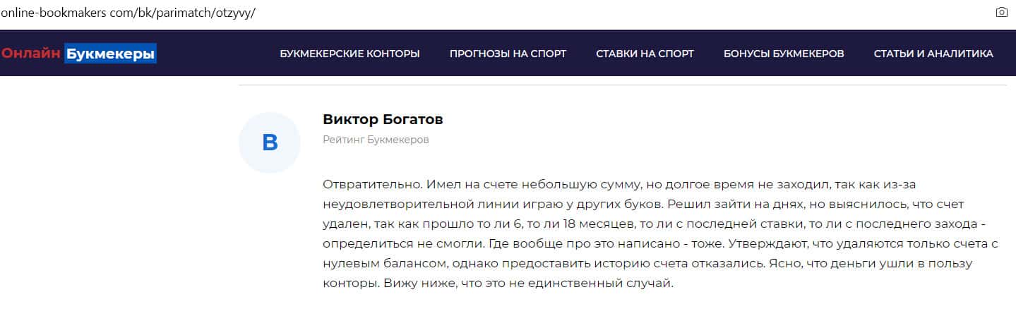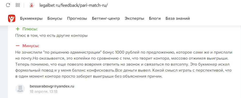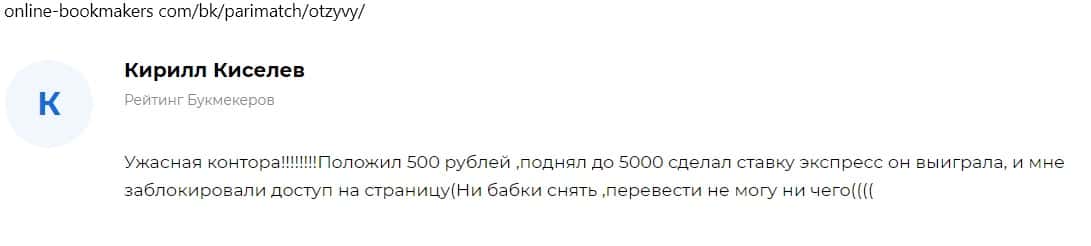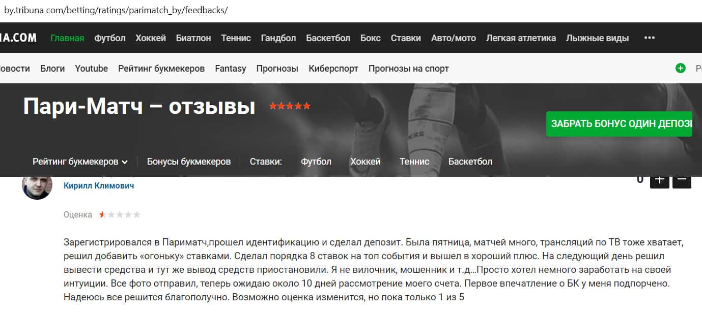 Еще один отзыв от возмущенного пользователя площадки Пари Матч говорит о том, что здесь сплошной обман, ставки режут, средства вывести невозможно.