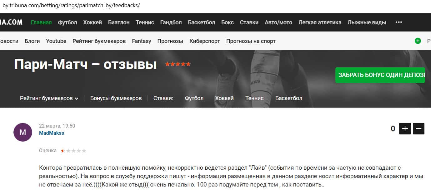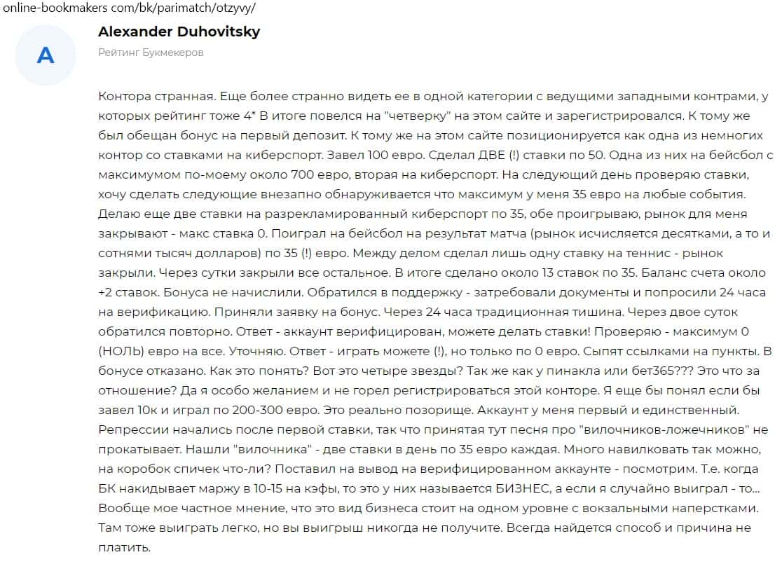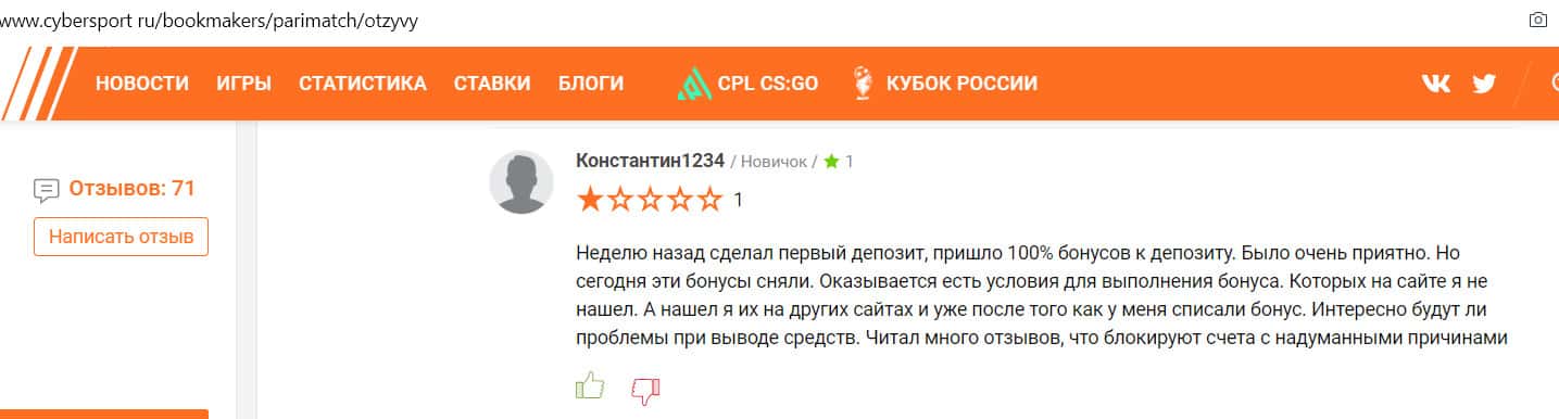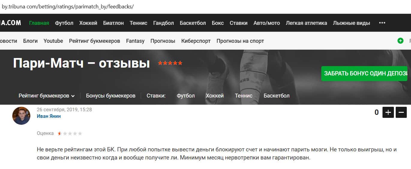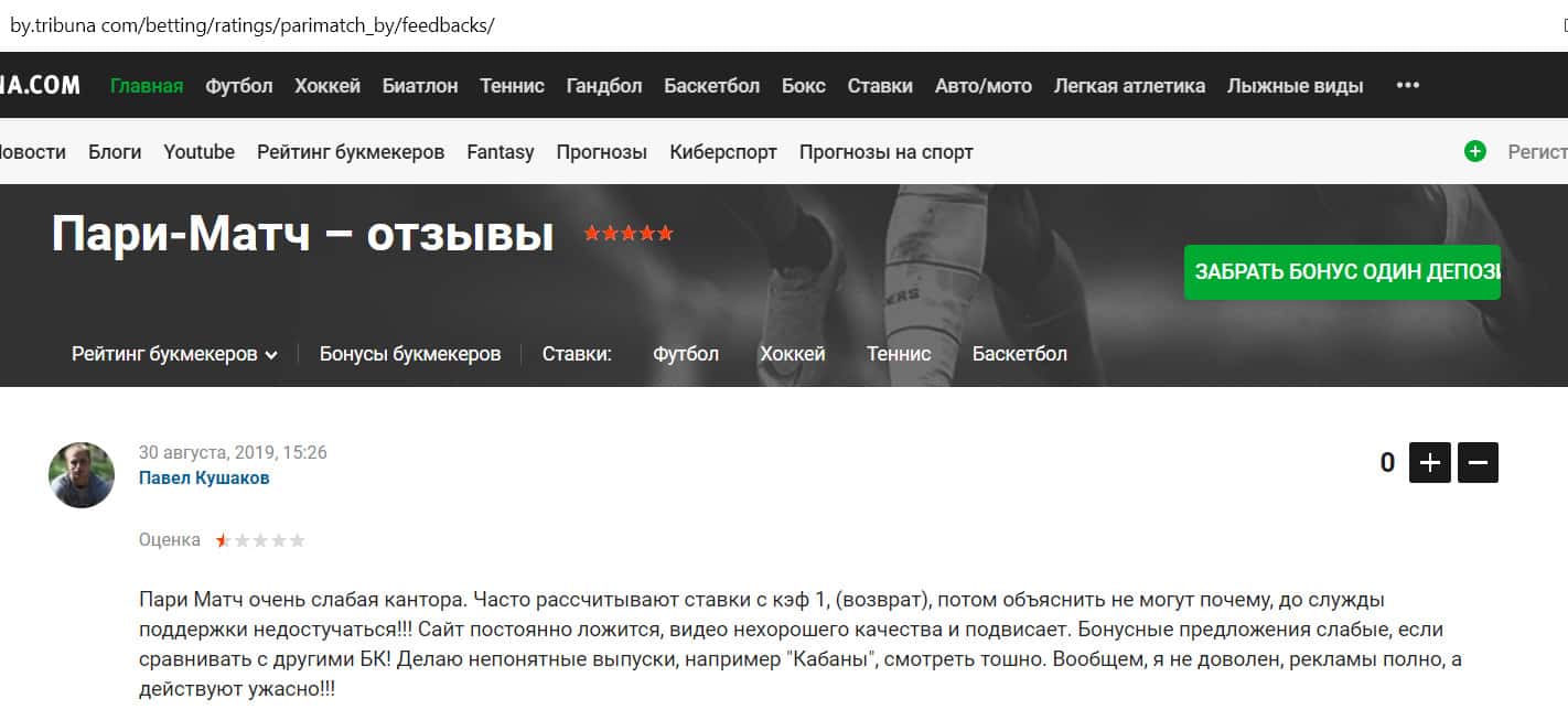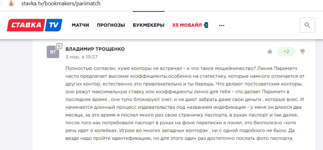 Еще один отзыв от возмущенного пользователя площадки Пари Матч говорит о том, что здесь сплошной обман, ставки режут, средства вывести невозможно.
