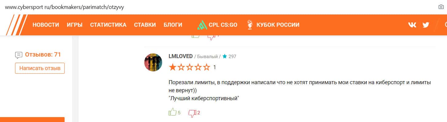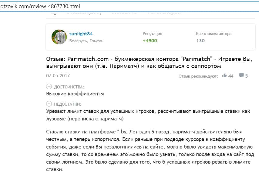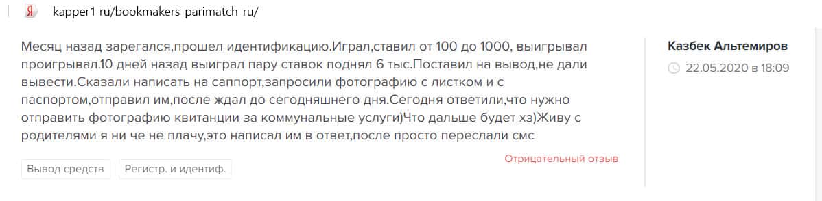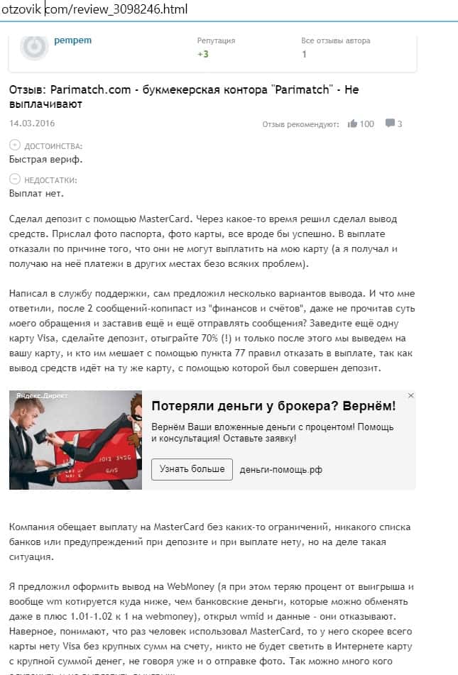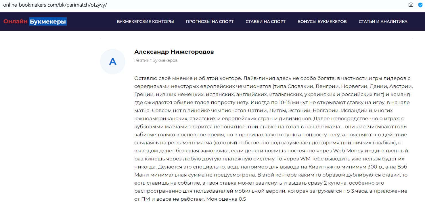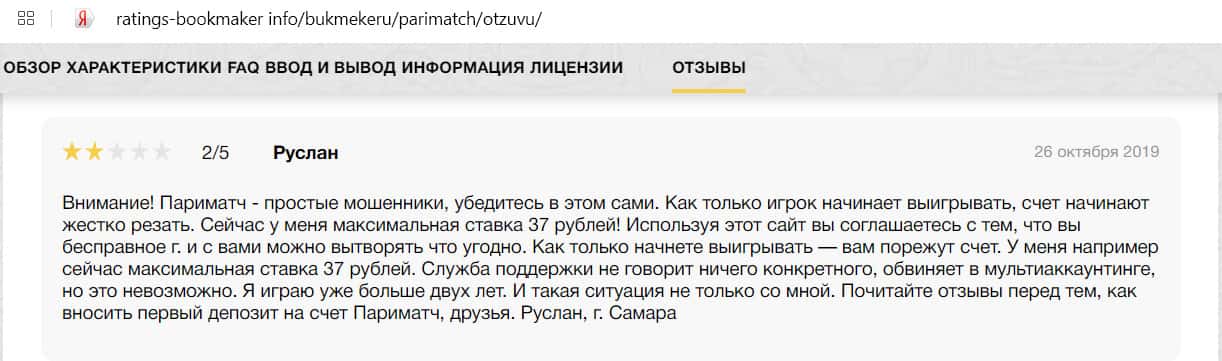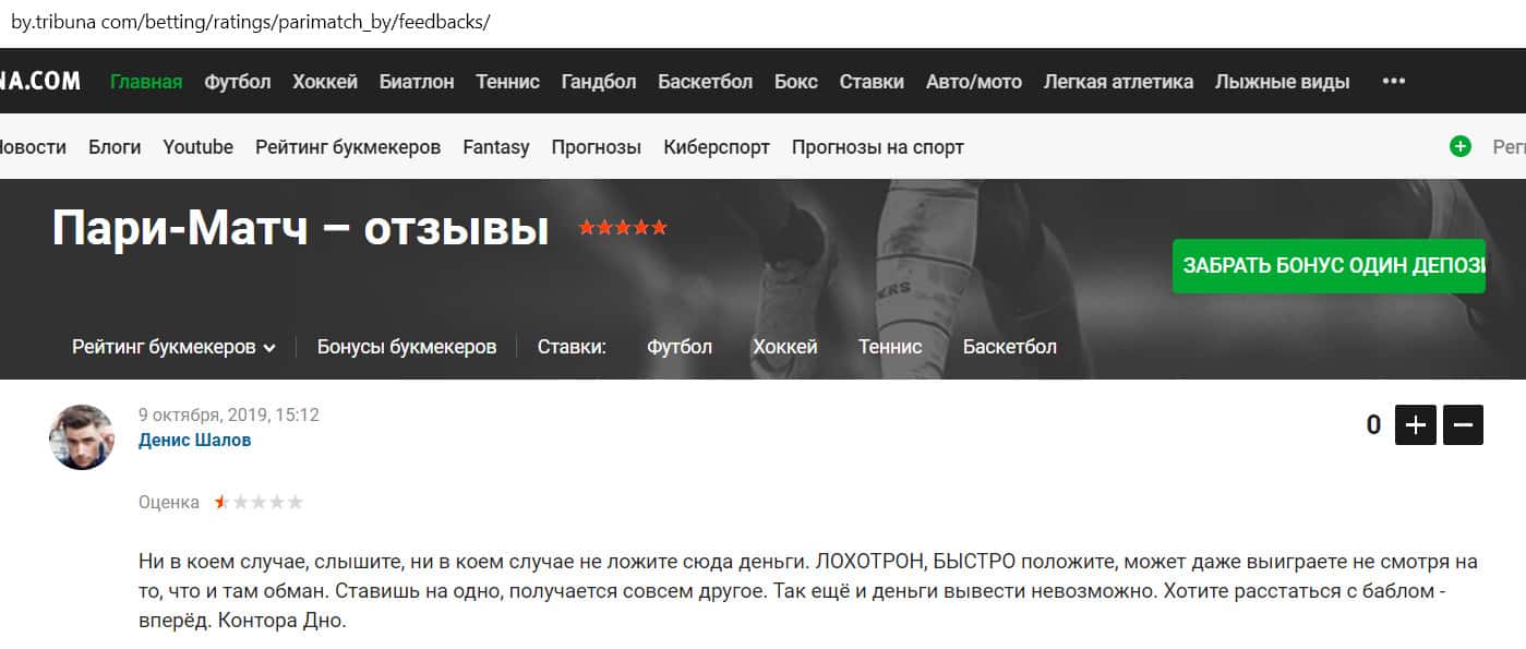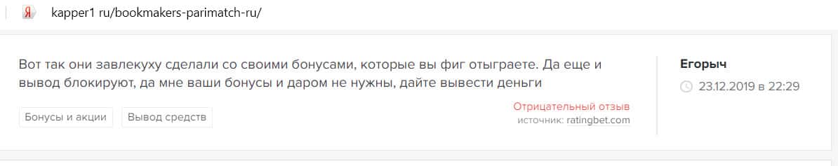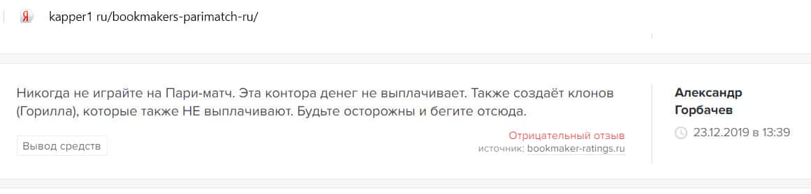 Еще один отзыв от возмущенного пользователя площадки Пари Матч говорит о том, что здесь сплошной обман, ставки режут, средства вывести невозможно.