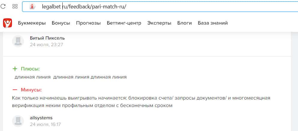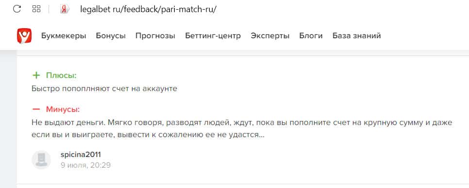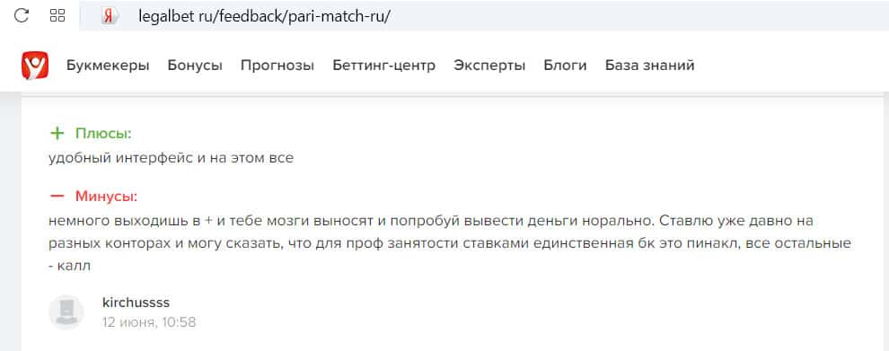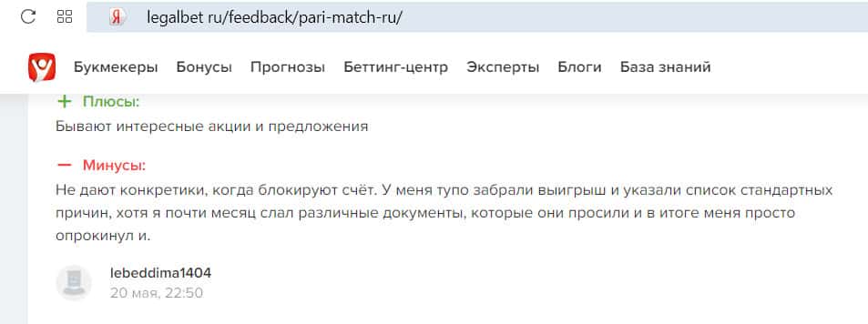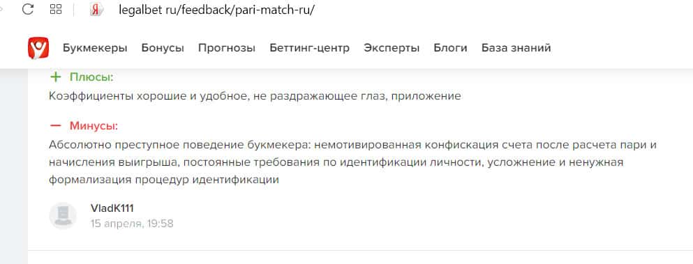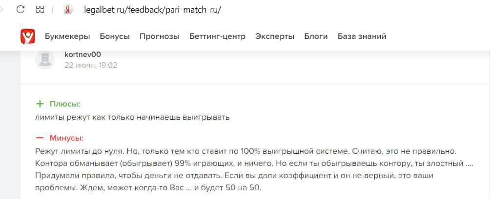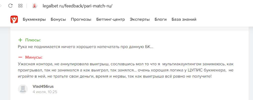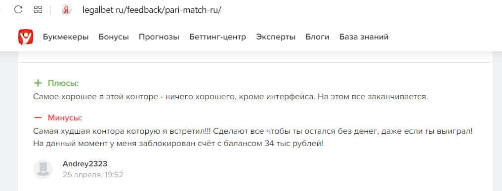 Очередной игрок пожаловался на Пари Матч. Он написал в отзыве на Легалбет, что, как только ты начинаешь выигрывать, сразу блокируют счет, и ты не можешь ничего сделать.
