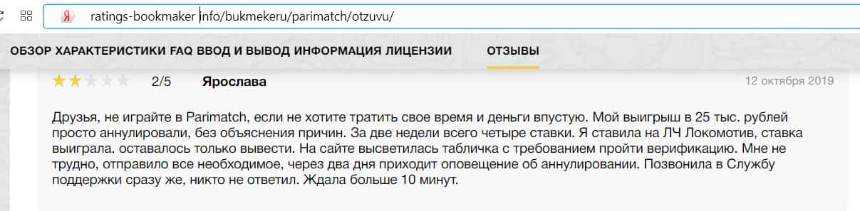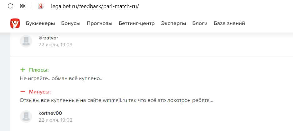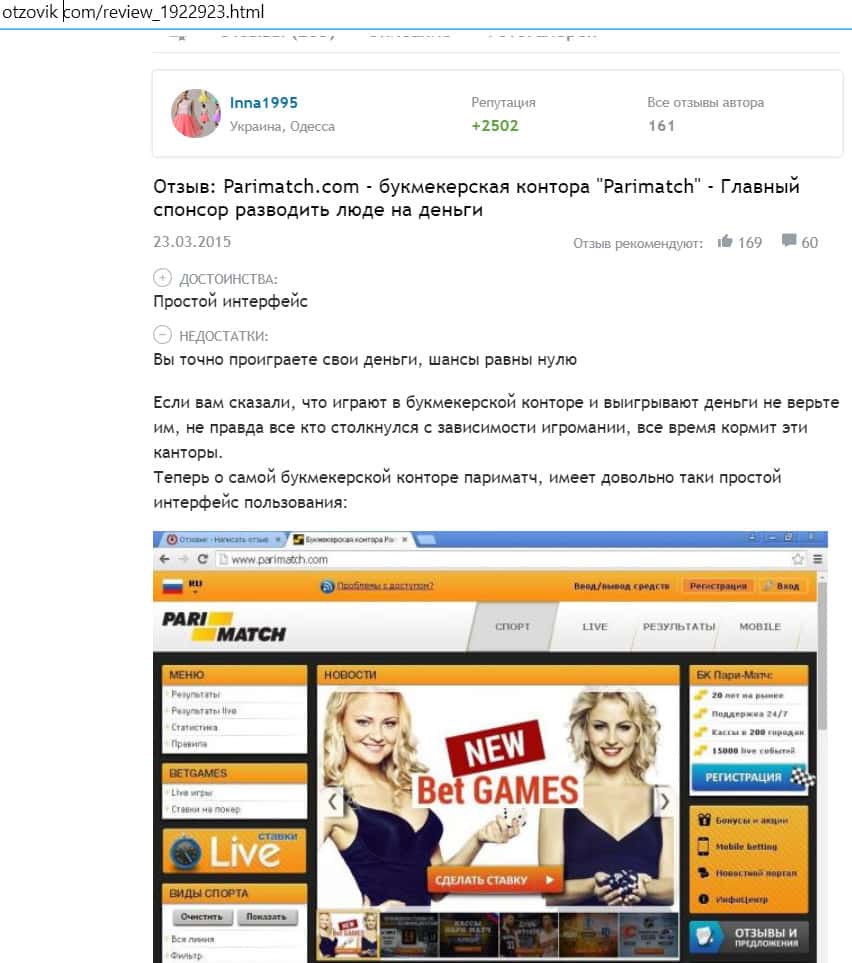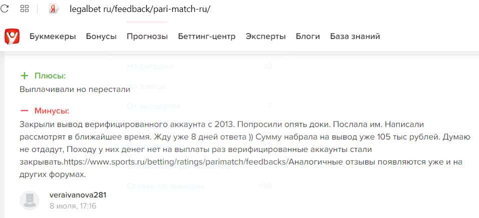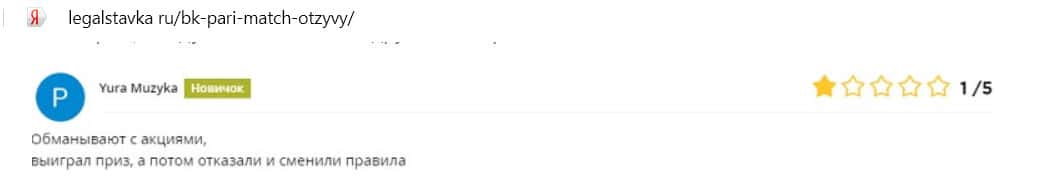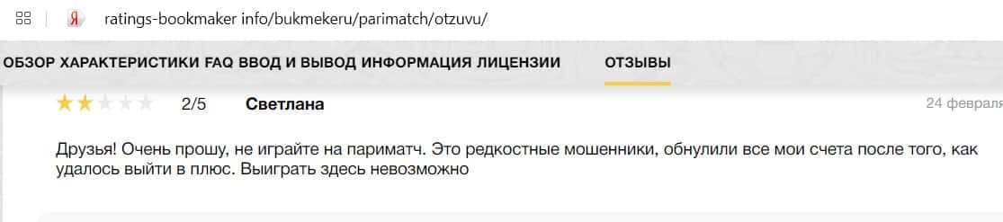 Инна оставила отзыв на сайте Отзовик, что контора Пари Матч разводит клиентов на деньги. Не верьте тем, кто говорит, что он выигрывал на этой жульнической площадке.