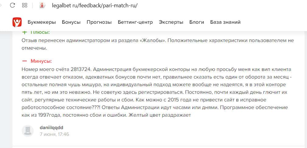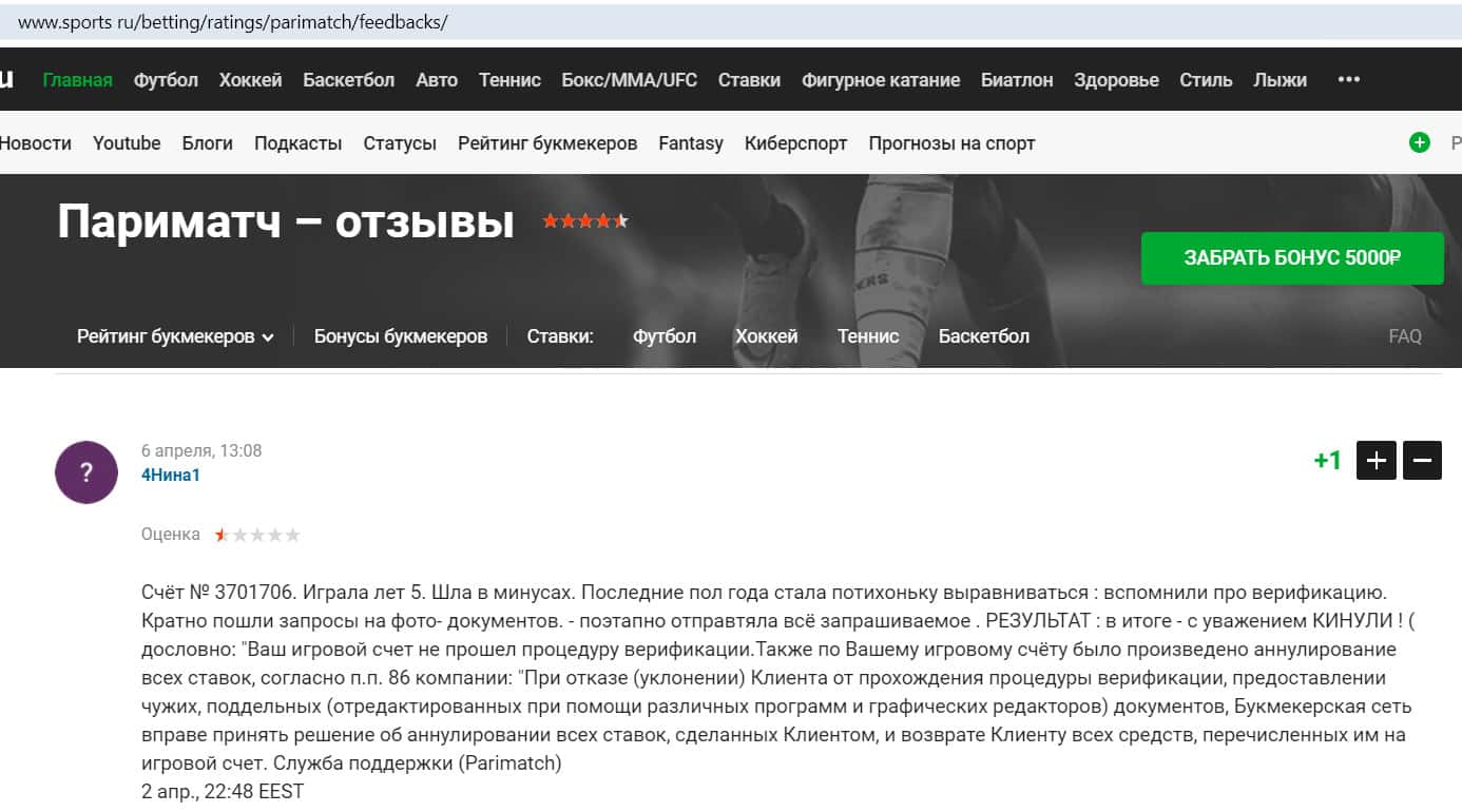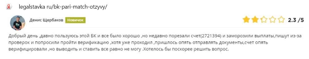 Очередной отзыв о Пари Матч, что администрация не дает выводить заработанные деньги. Человека банят по разным причинам, например, что не прошел верификацию.
