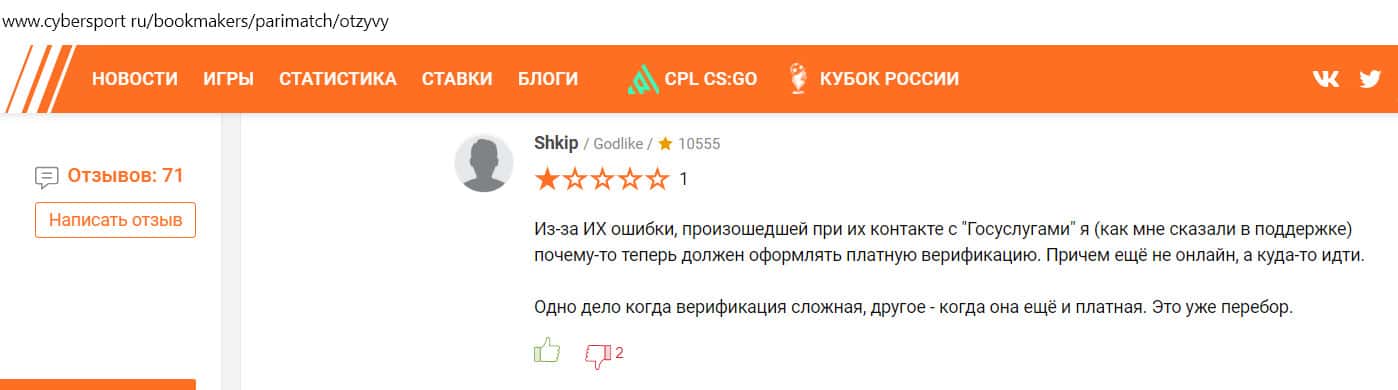 Пользователю площадки Пари Матч сказали, что он должен оформлять платную верификацию, причем не он-лайн, а надо куда-то идти. Это уже явный перебор.