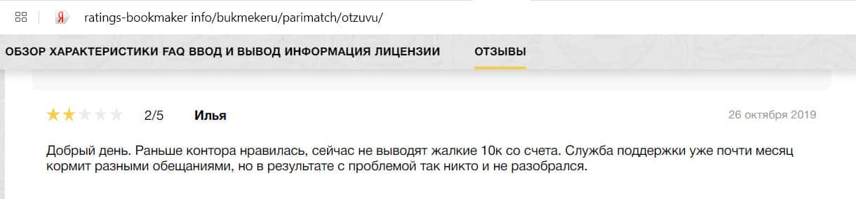 Другой пользователь пишет, что создатели PariMatch - мошенники, не выводят деньги, на письма отвечают шаблонно, поддержки не дождешься.