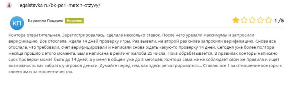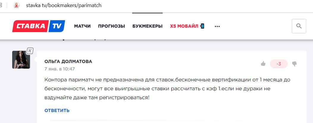 Ольга написала отзыв о том, что Пари Матч не предназначена для ставок. Здесь идут бесконечные верификации от 1 месяца до бесконечности. Не вздумайте регистрироваться!