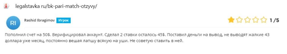 Рашид написал в отзыве о букмекере Пари Матч, что это до такой степени жадные мошенники, что не выводят даже мелкие суммы. Ему отказали в выплате 43 долларов.