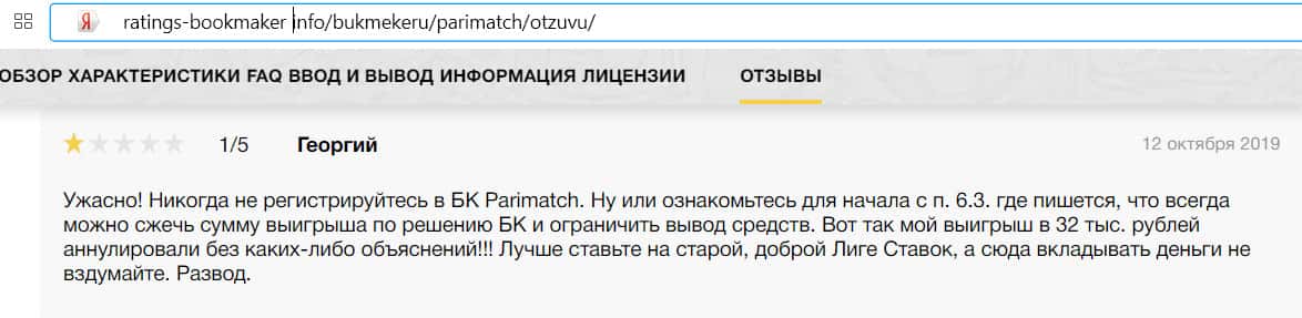 Георгий написал отзыв на сайт Рейтингсбукмекер, что но потерял 32 000 рублей на площадке Пари Матч. Это было решение букмекера на основании их договора с клиентом.