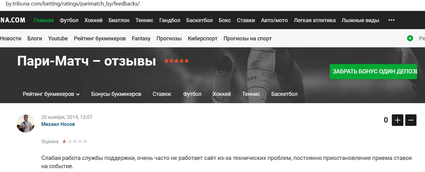 По мнению Михаила, контора Пари Матч не заслуживает высокой оценки. Сайт часто не работает из-за технических проблем, постоянно приостановление приема ставок на событие.