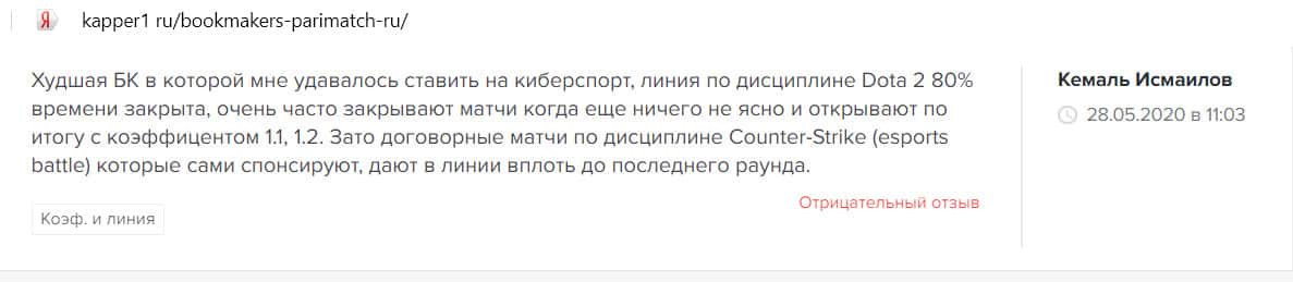 Кемаль сделал негативный отзыв о Пари Матч. Он пишет, что очень часто закрывают матчи когда еще ничего не ясно и открывают с низким коэффициентом. Контора - худшая из всех!