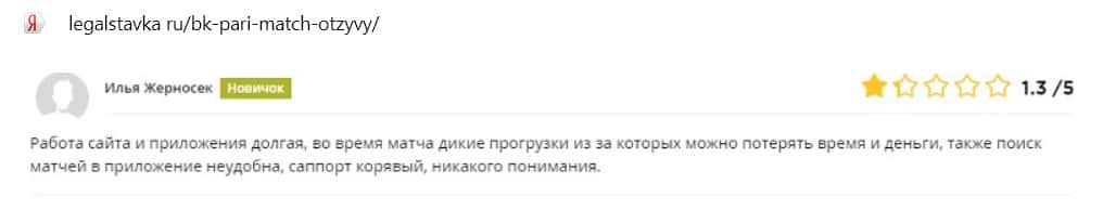 По мнению Ильи, сайт Пари Матч оставляет желать лучшего: дикие прогрузки, что влияет на потерю денег из-за нехватки времени, саппорт неадекватный, неудобный интерфейс.