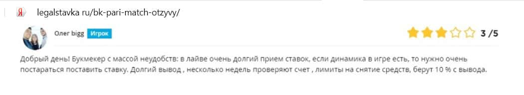 Олег пишет на сайте Легалставка, что букмекер Пари Матч обладает массой неудобств: очень долгий прием ставок в лайве, длительный вывод, морока с верификацией.