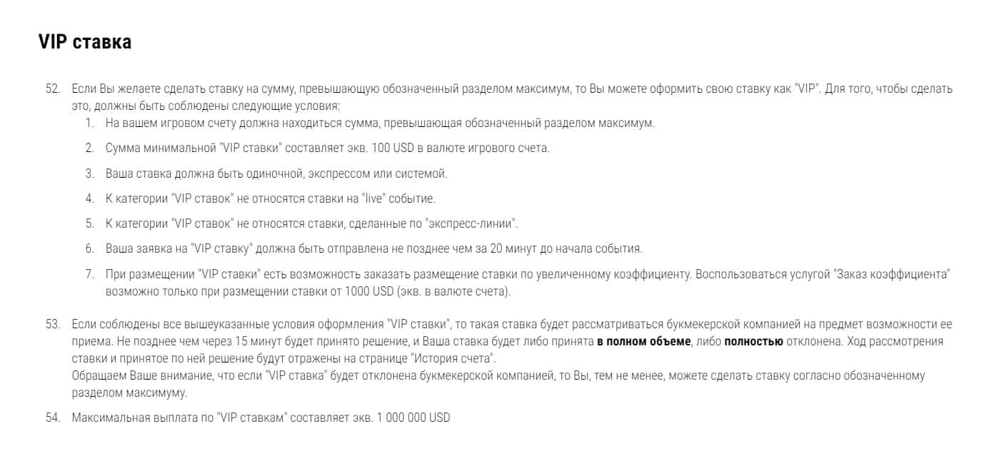 Также имеется отдельный пункт договора о вип ставках, где описаны условия по ставкам, превышающим максимальные пороги.