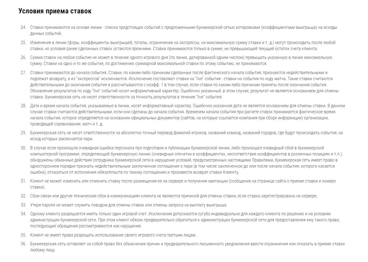 Далее идет раздел Условия приема ставок, в котором рассказывается о правилах приема ставок для пользователей. Только вот создатели лохотрона сами часто нарушают их