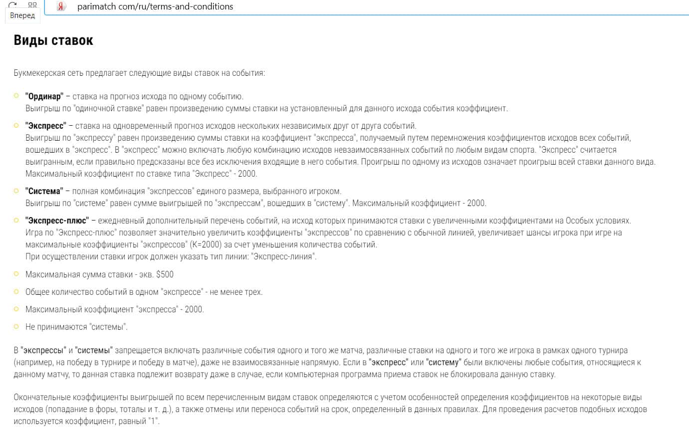 В разделе клиентского соглашения PariMatch под названием Виды ставок дается информация о том, какие ставки может делать клиент и их нюансы.