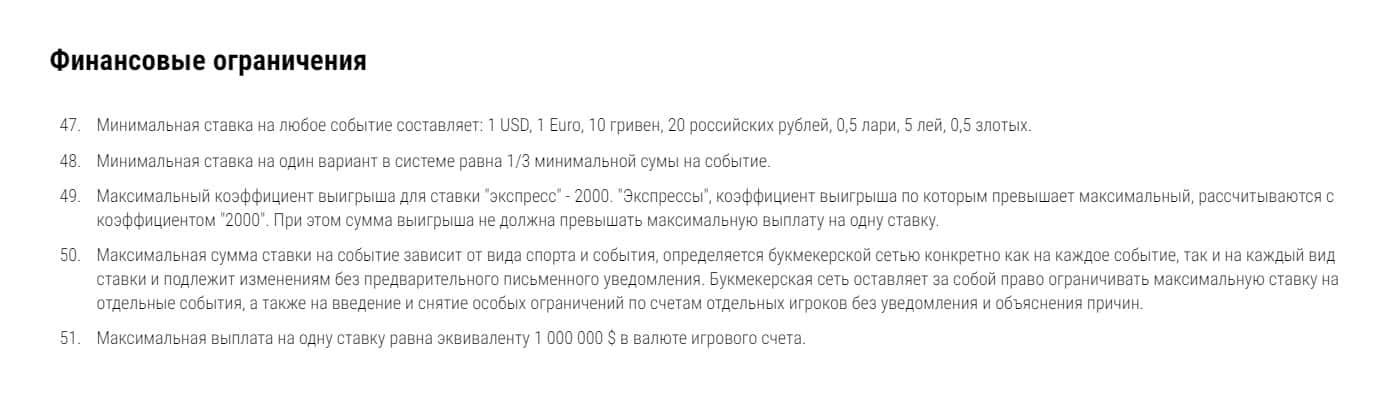 В разделе о финансовых ограничениях клиент может узнать о размерах минимальных ставок и максимальных порогах на выплаты.