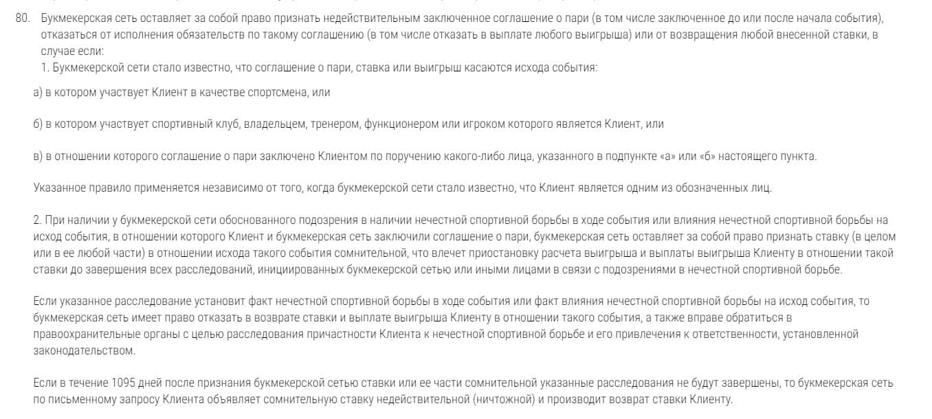 Пункт 80 договора описывает ситуации, при которых ставки признаются недействительными. Этот пункт часто используется для признания игрока мошенником.