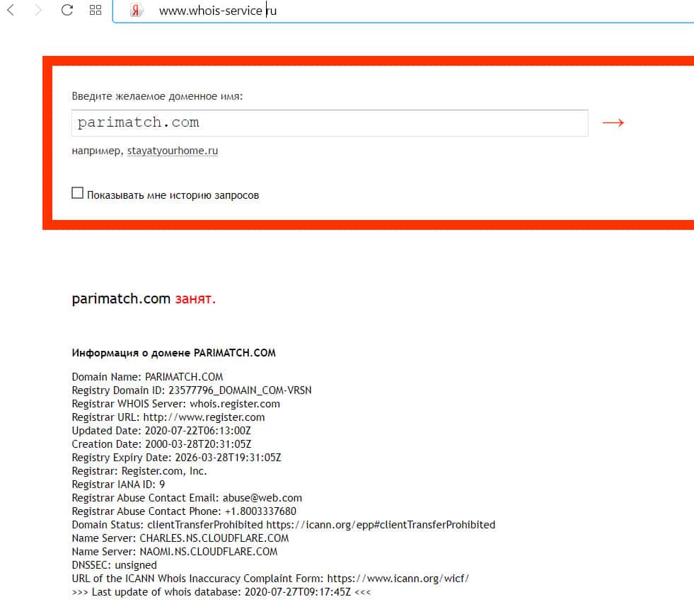 Кому принадлежит доменное имя букмекерской конторы Пари Матч, выяснить не получилось, так как владелец домена скрыл свое имя. Это характерно для мошенников.