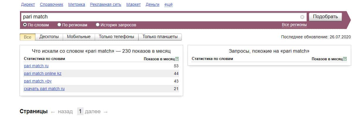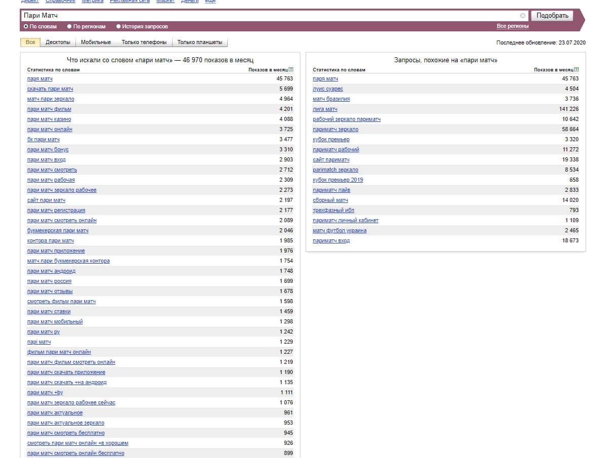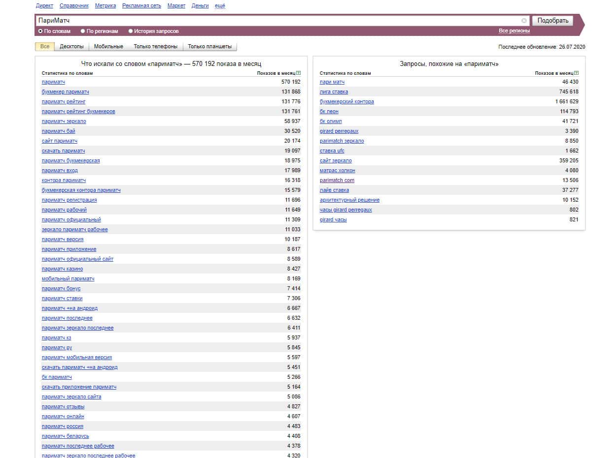 Название бренда "ПариМатч" на русском языке без пробела пользователи хотели найти в системе Яндекс 570 192 раза.