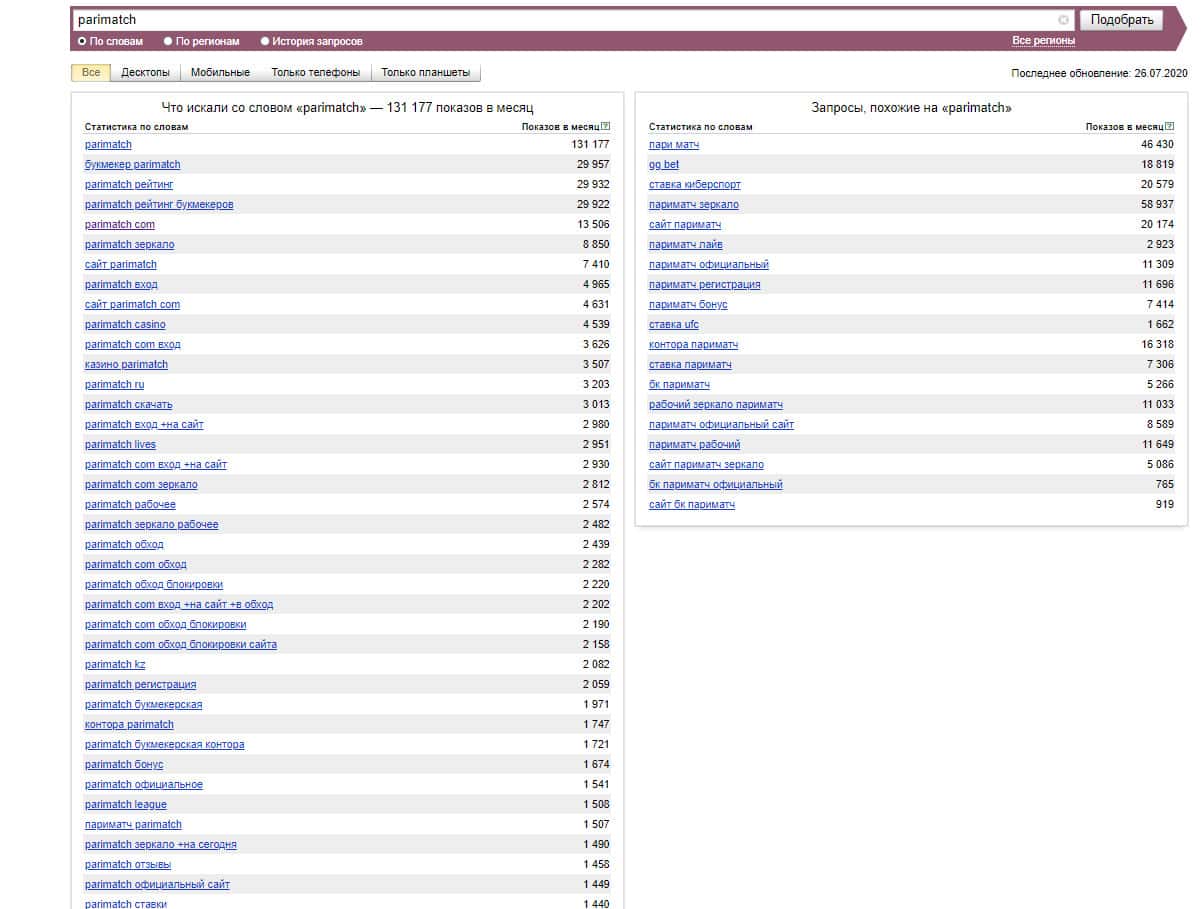 Название бренда "parimatch"на английском языке пользователи искали в системе Яндекс довольно большое количество раз: 131 177 показов за месяц.