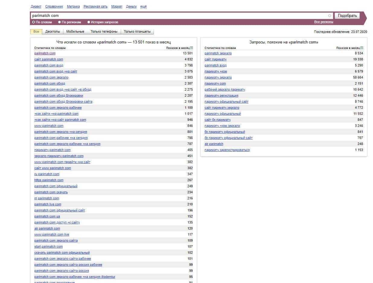 Количество запросов по доменному имени "parimatch com", написанного с пробелом, по данным сервиса Яндекс Вордстат, равно почти тем же показателям: 15601 показ.