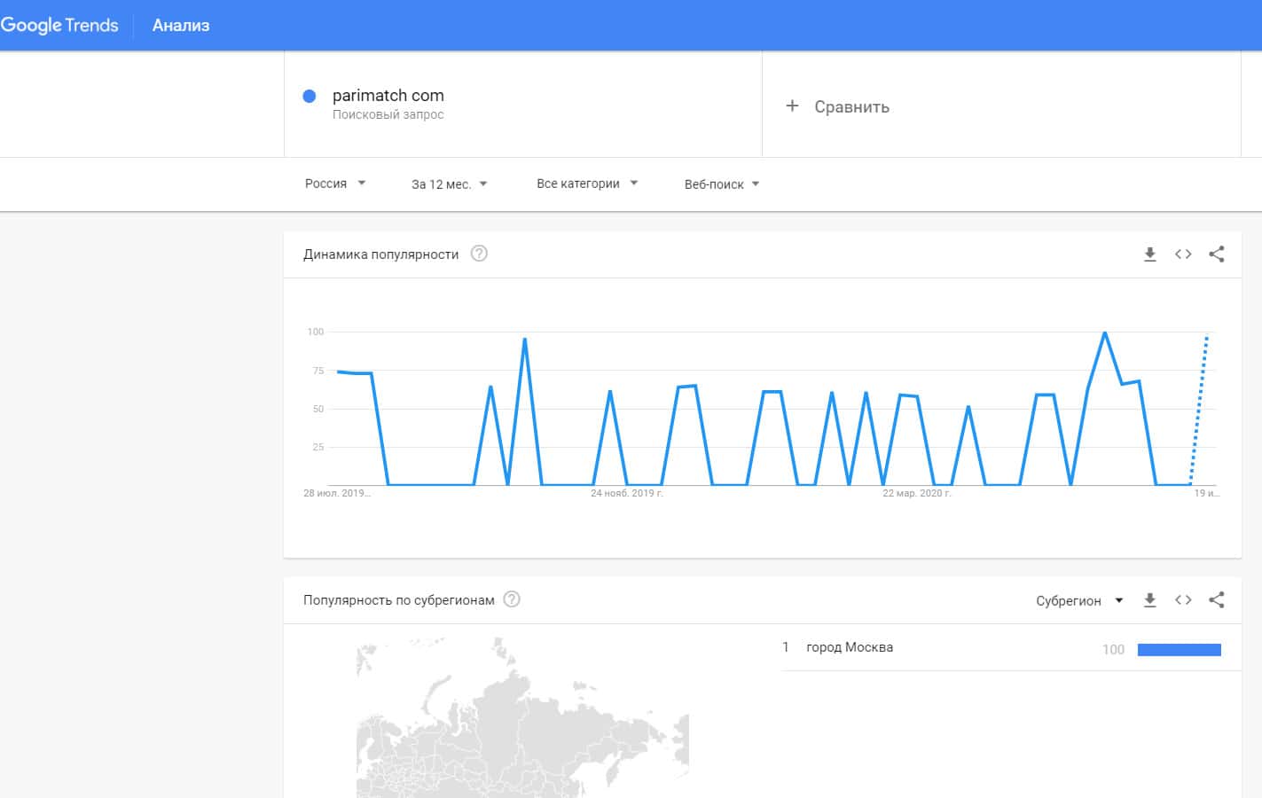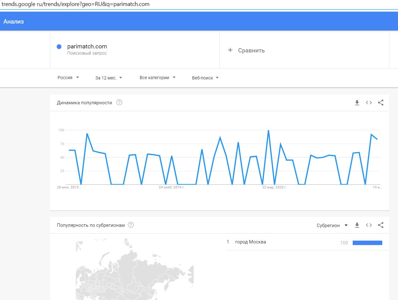 Количество запросов от пользователей по доменному имени "parimatch com" в сервисе Гугл Тренд было сконцентрировано в основном в Москве.