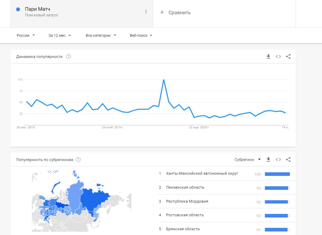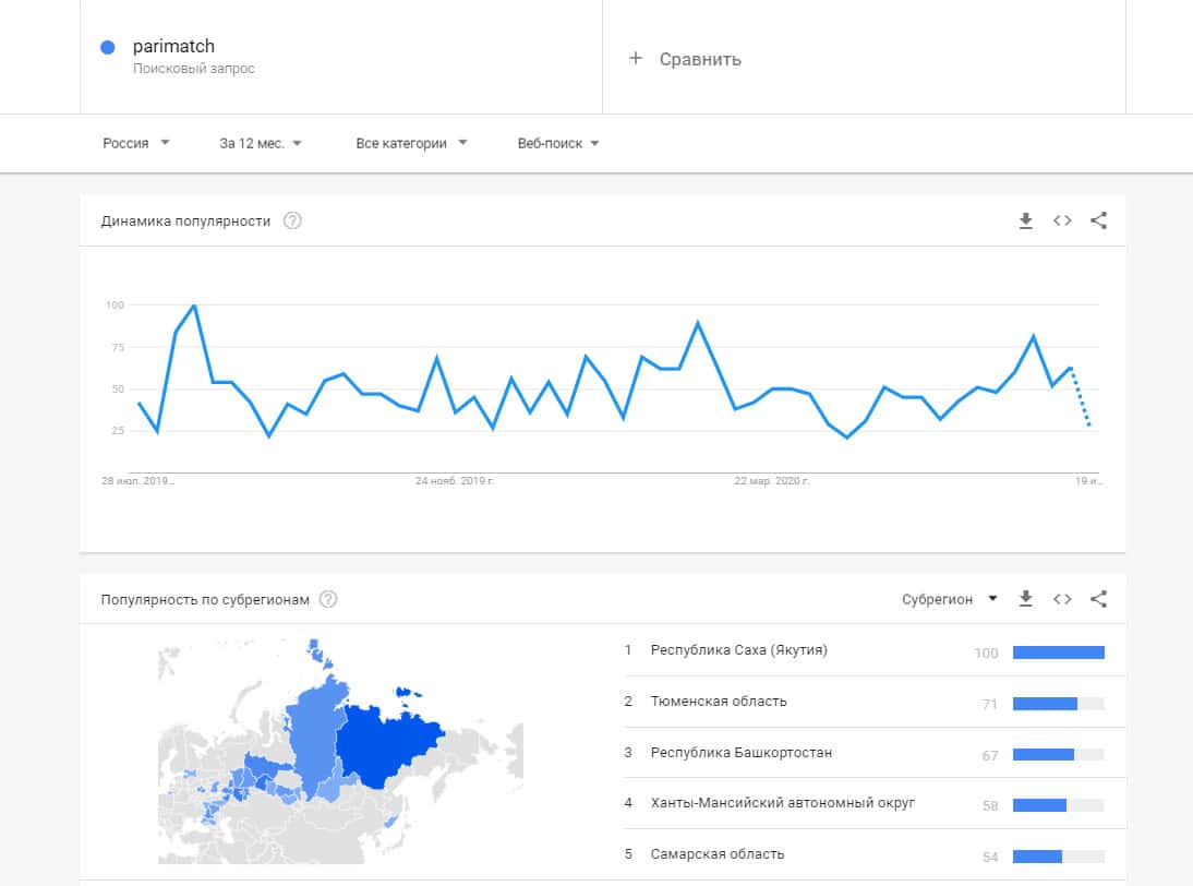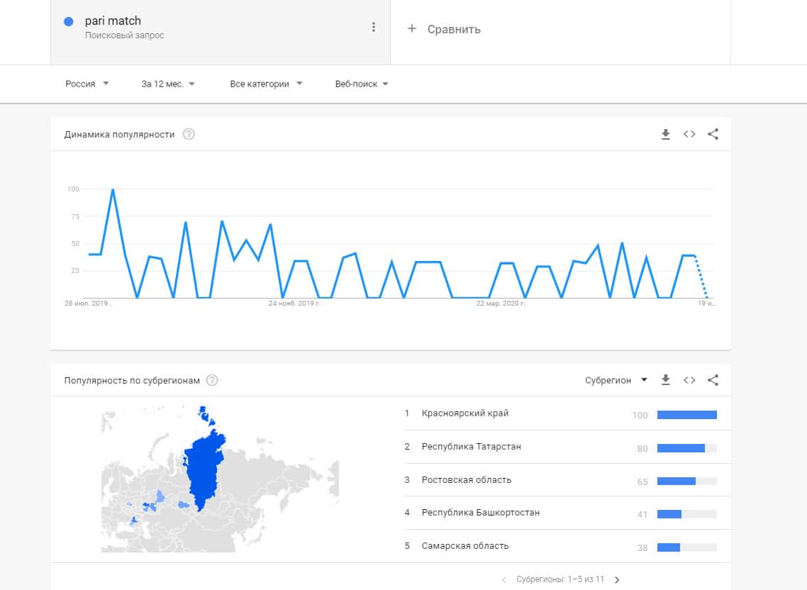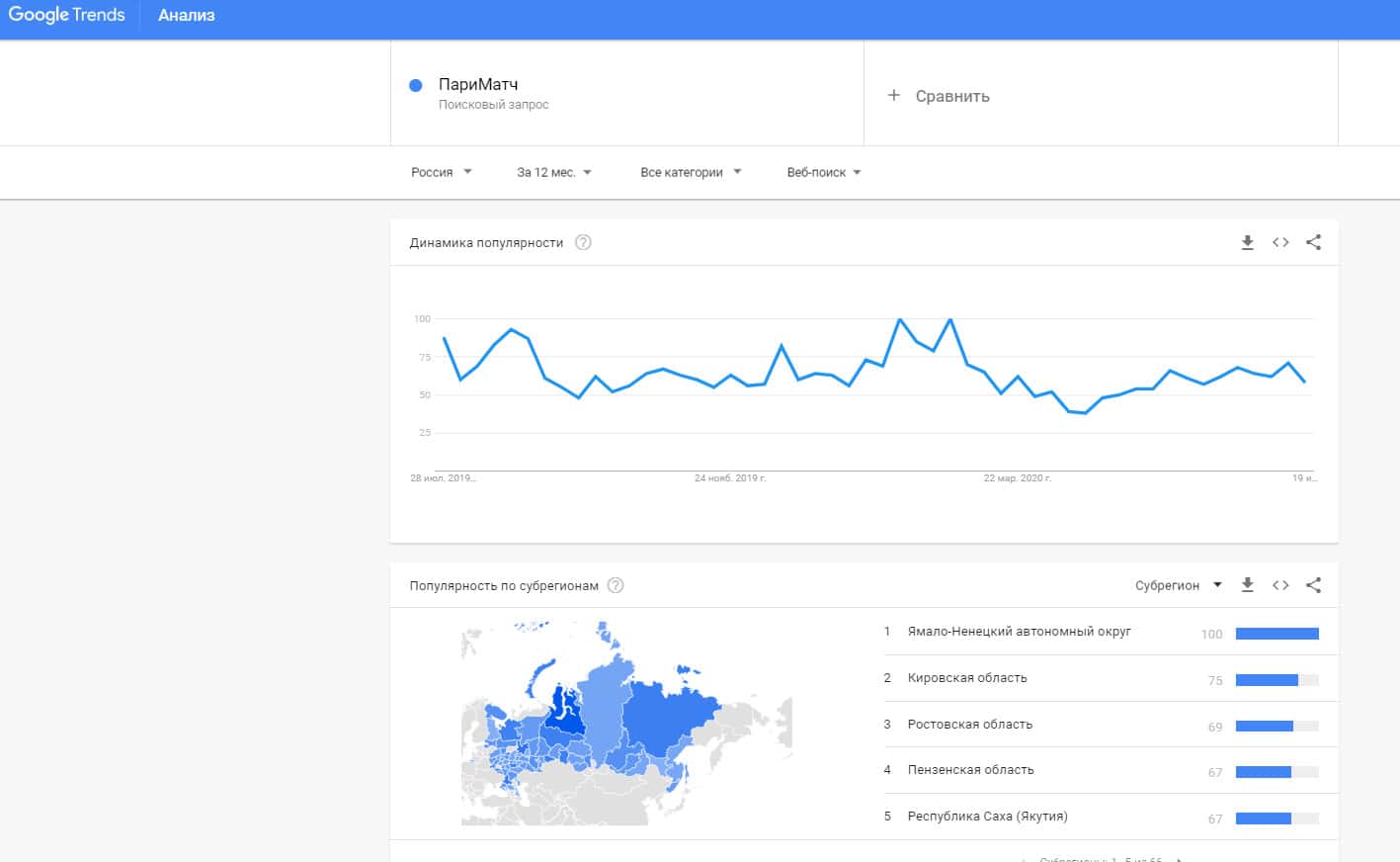 Название бренда "Пари Матч" на русском языке искали в системе Гугл преимущественно жители ЯНАО.