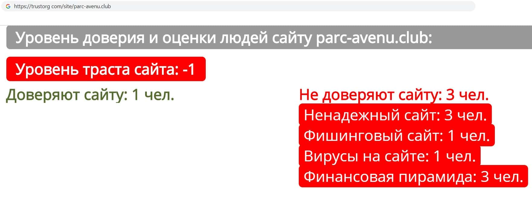 На интернет ресурсе "Доверие в Сети" мы нашли информацию о уровне доверия к сайту кидал Parc-Avenu Club. Оказалось, что контора имеет отрицательный уровень доверия, так как похожа на финансовую пирамиду.
