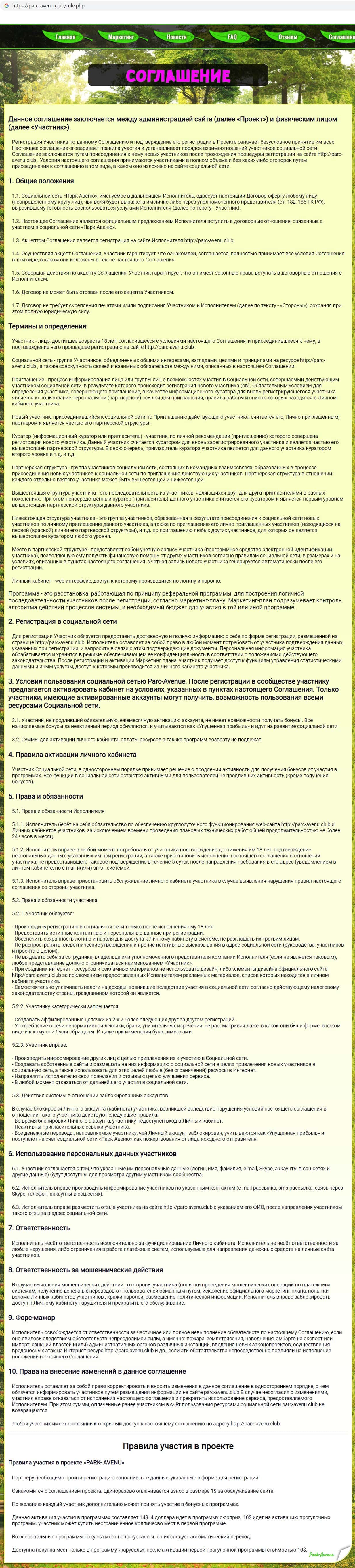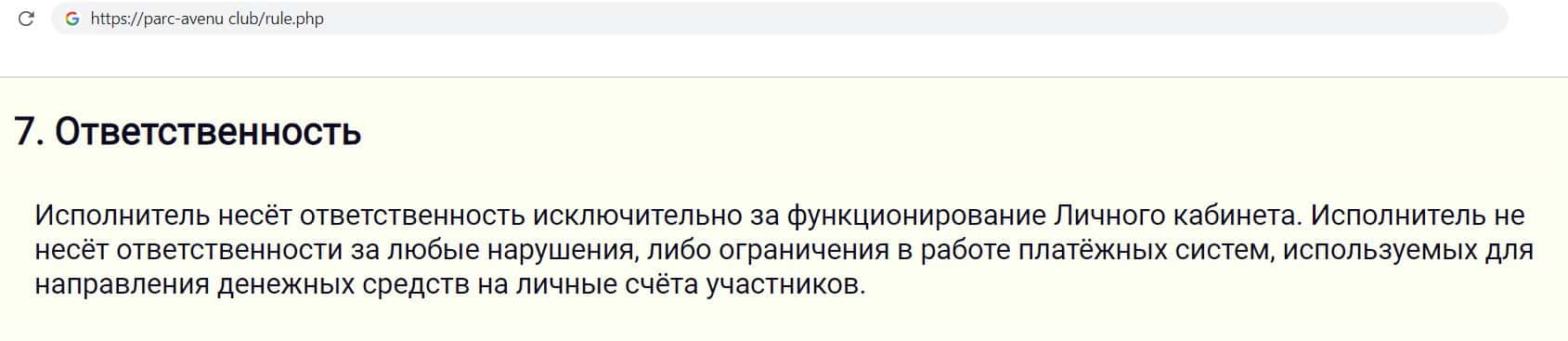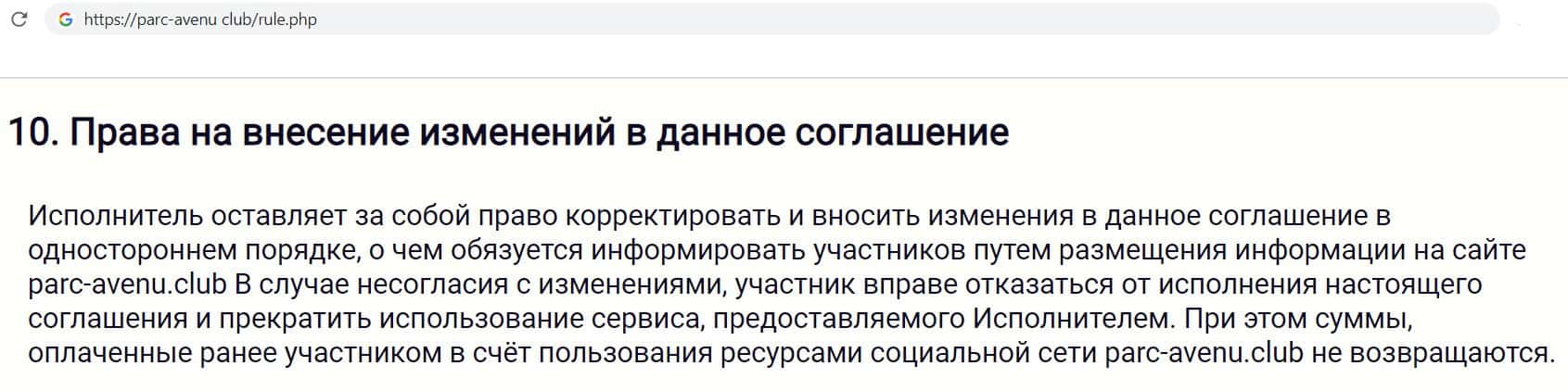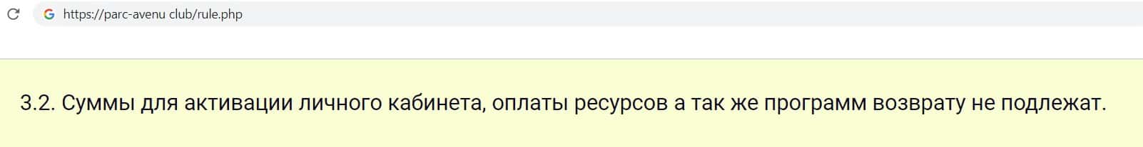 Так же лохотронщики Parc-Avenu Club в своём соглашении указали, что денежные суммы, которые клиент выплатил за активацию кабинета и оплату ресурсов, возврату не подлежат.