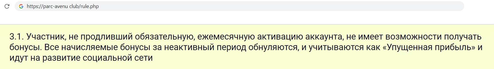 Компания кидал Parc-Avenu Club предоставила клиентское соглашение, в котором есть несколько странных пунктов, например в данном пункте фирма говорит, что если клиент не продлевает активацию аккаунта, то бонусы ему недоступны.
