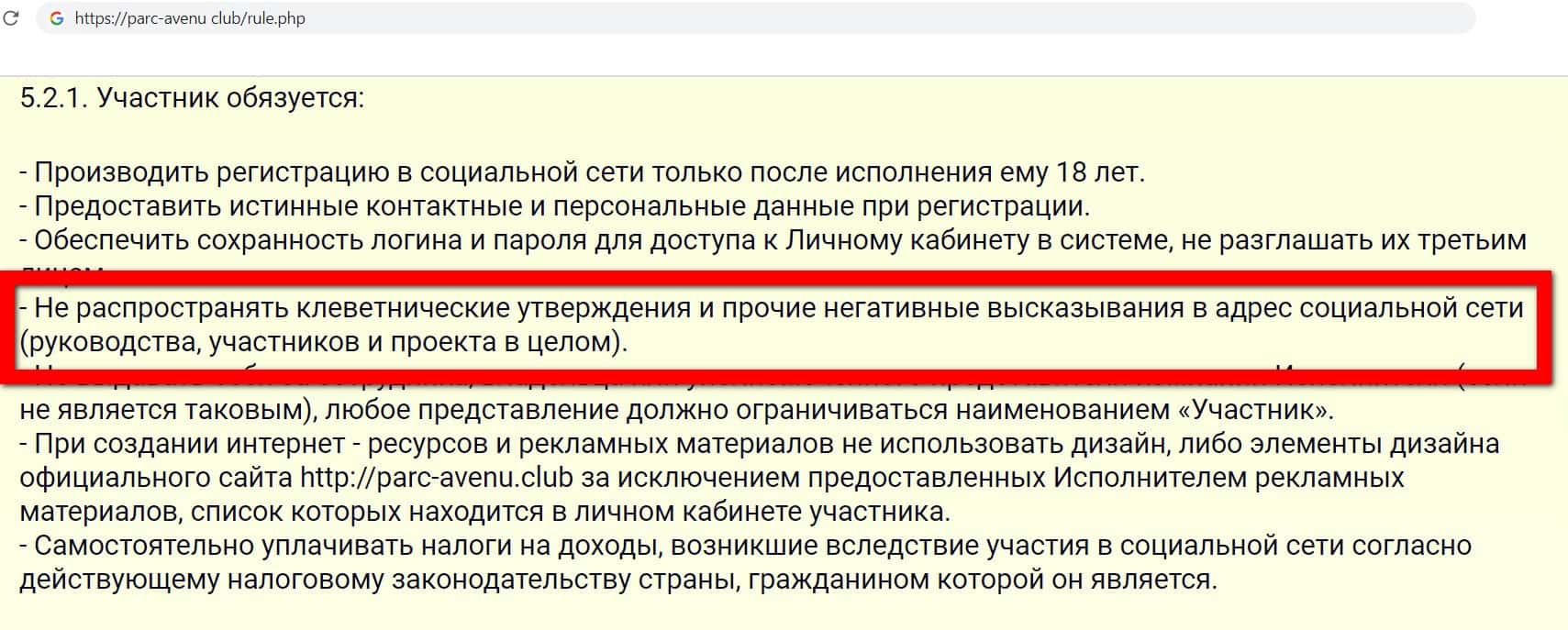 Да бы обезопасить себя и сохранить репутацию фирмы, кидалы Parc-Avenu Club заставили клиентов согласится с пунктов, в котором им запрещается писать негативную информацию о фирме, в том числе и отзывы.