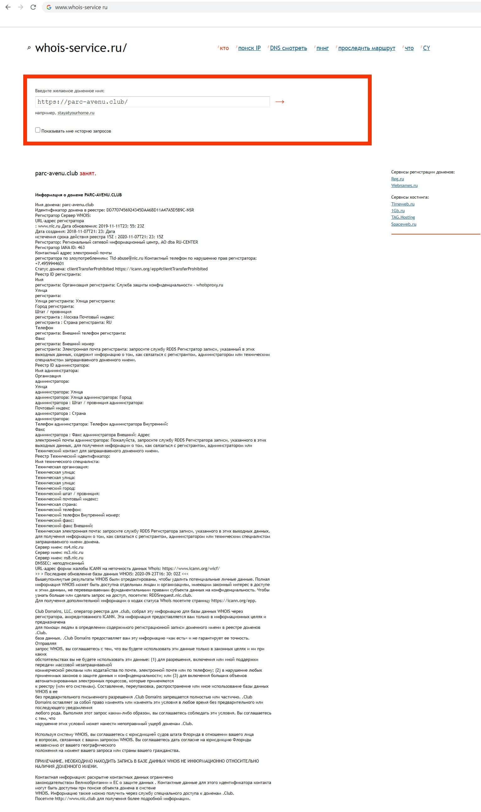 Через интернет ресурс whois-service ru мы проверили сайт компании кидал Parc-Avenu Club что бы узнать владельца домена, но оказалось, что компания скрывает владельца своего доменного адреса.