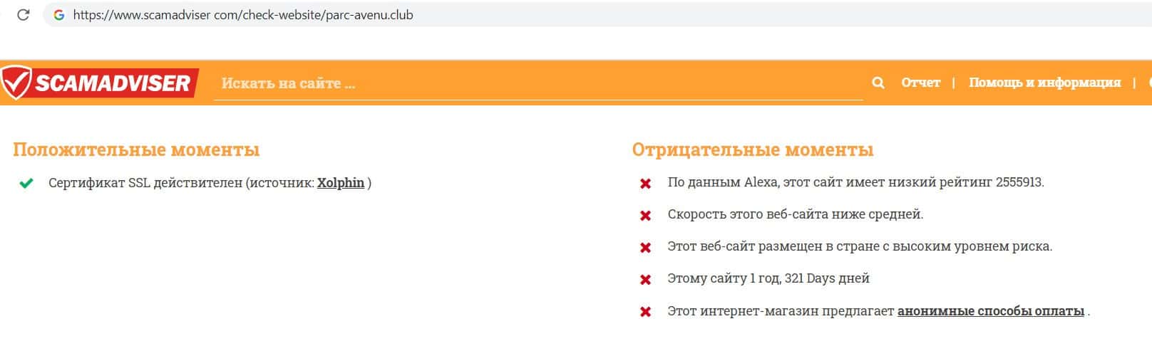 - Мнение сайта scamadviser com о финансовой пирамиде Парк Авеню Клуб