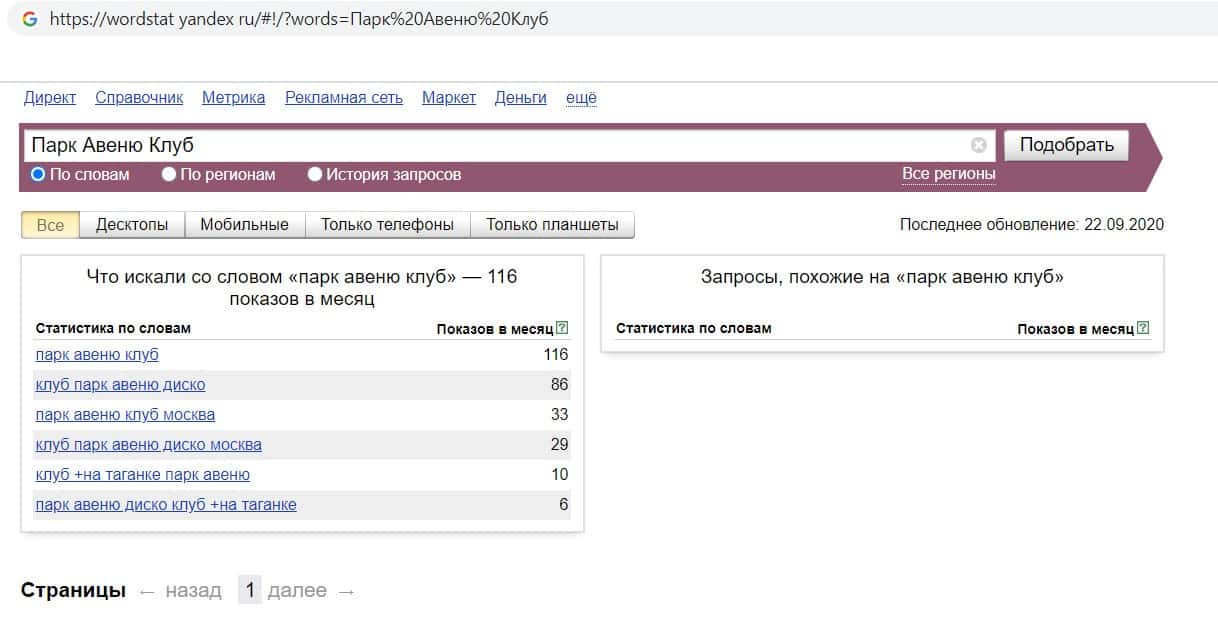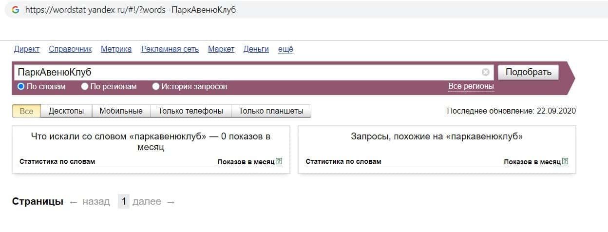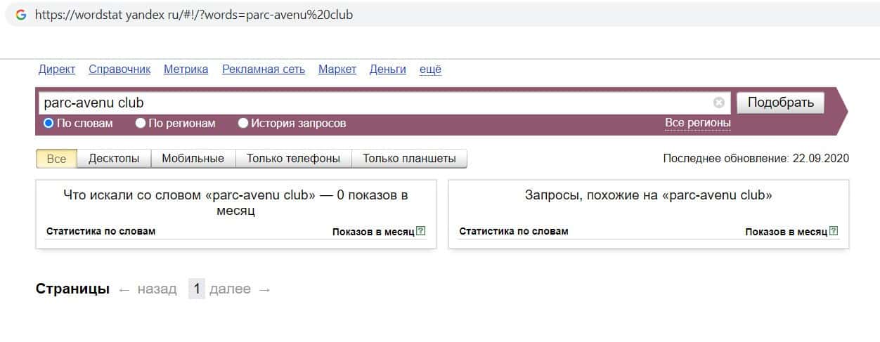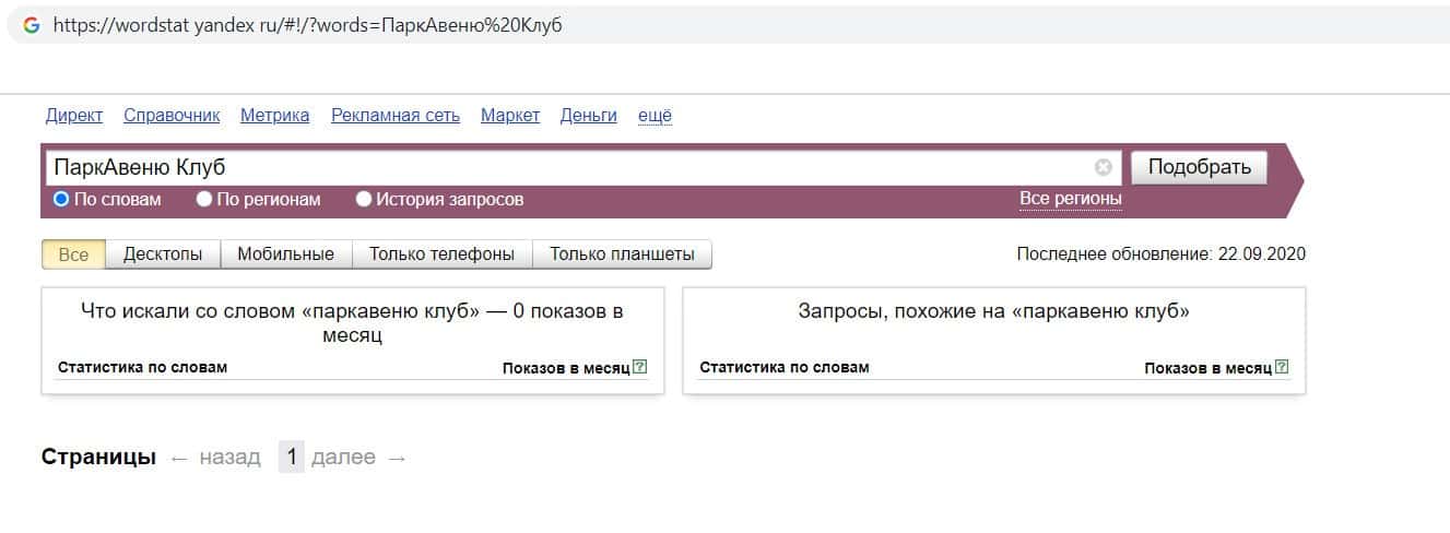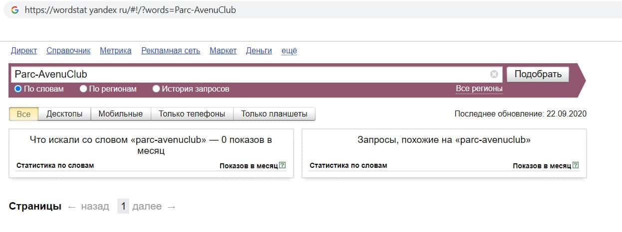 Ещё мы проверили количество запросов кидал Парк Авеню Клуб по русскоязычному названию, но без пробелов, а именно "ПаркАвенюКлуб". Но по прежнему результата нет.