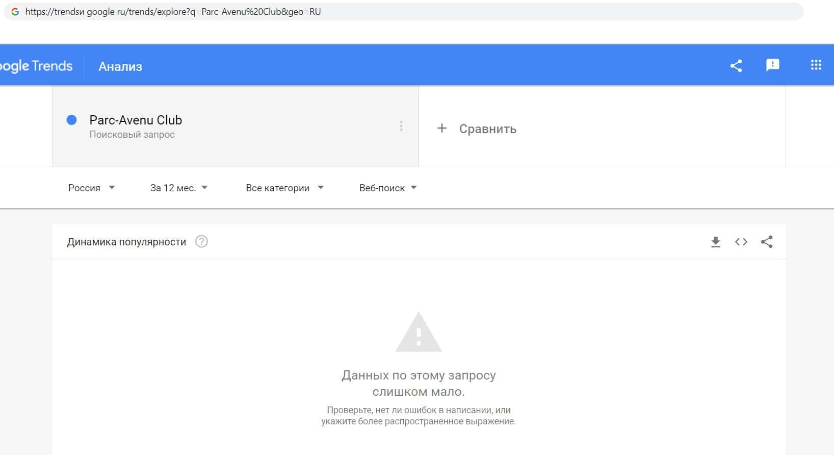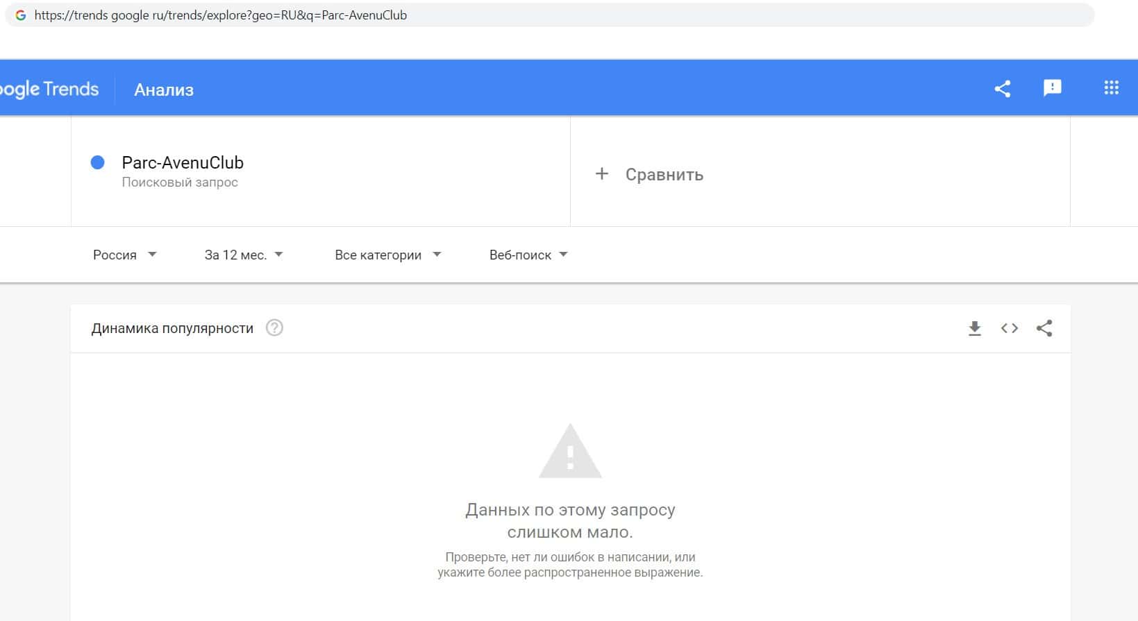Так же мы проверили количество запросов компании мошенников Parc-Avenu Club по названию конторы но без пробела, а именно "Parc-AvenuClub". Но результата всё равно нет.