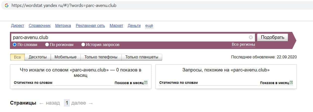 Решили мы так же проверить и количество запросов компании кидал Парк Авеню Клуб по домену фирмы, но без точки, а именно "parc-avenu club". Но результат опять оказался нулевым.