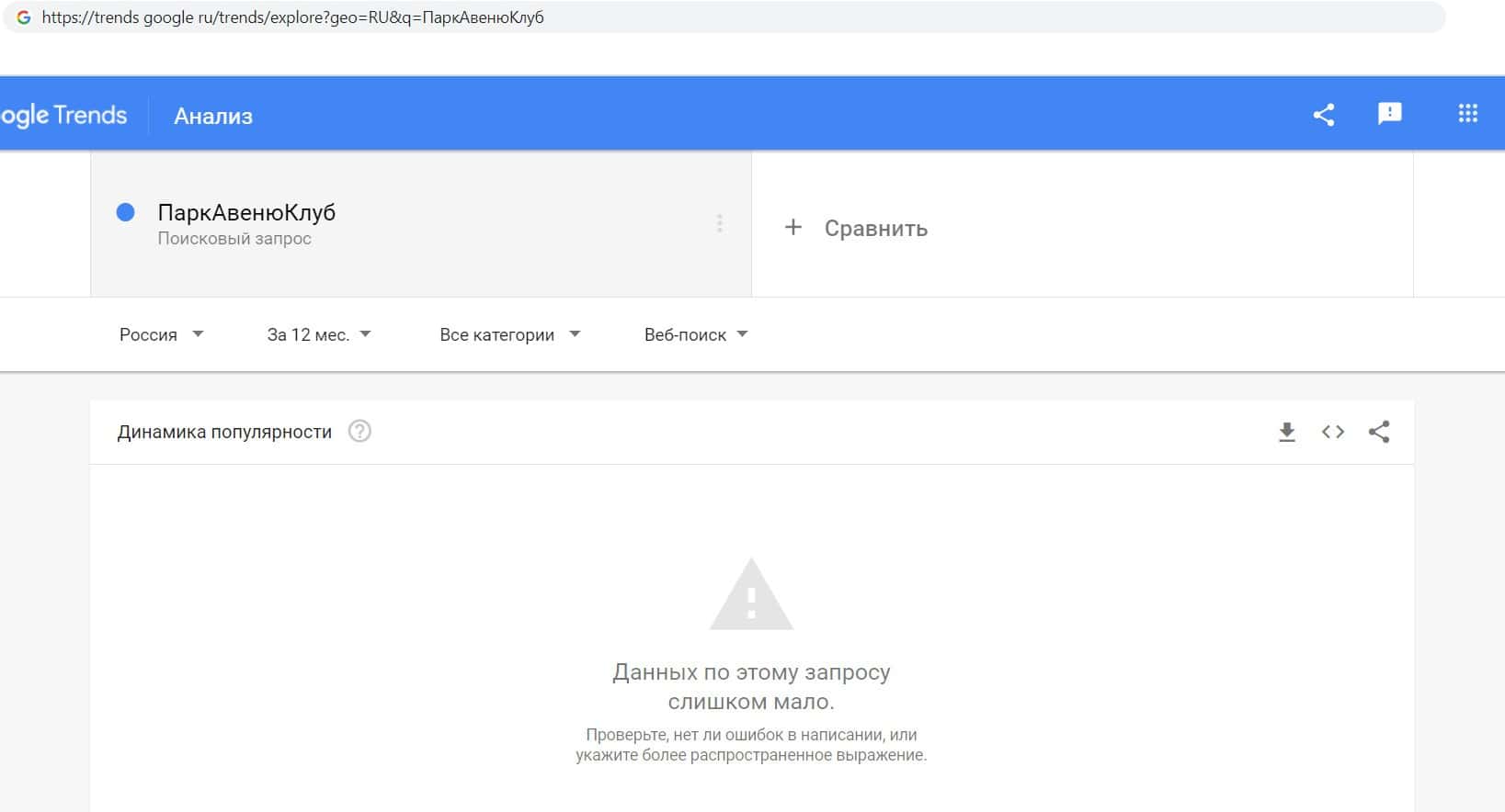 Далее мы проверили количество запросов компании разводил Парк Авеню Клуб по русскоязычному названию с одним пробелом, а именно "ПаркАвеню Клуб". Но результат снова нулевой.