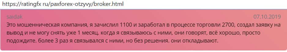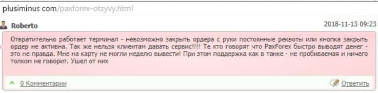 А вот еще одни лопухи, попавшиеся на уловки мошенников Пакс Форекс. Один человек рассказал, что он торговал в этой конторе нормально до того момента, как не поставил заявку на вывод средств.