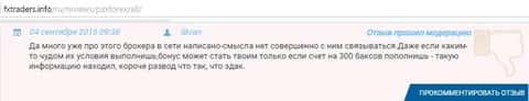 Интернет-пользователь сайта fxtraders info также высказал свое мнение по поводу мошеннической конторы Пакс Форекс. Он рассказал как работает их бонусная программа. Там два варианта. Первый - это нужно выполнить определенное количество сделок, которые нереально сделать, не слив депозит. А второй - это вкинуть еще 300 долларов, дабы заместить бонусные деньги. Но по итогу ничего не получите, в лучшем случае это продолжите торговлю.