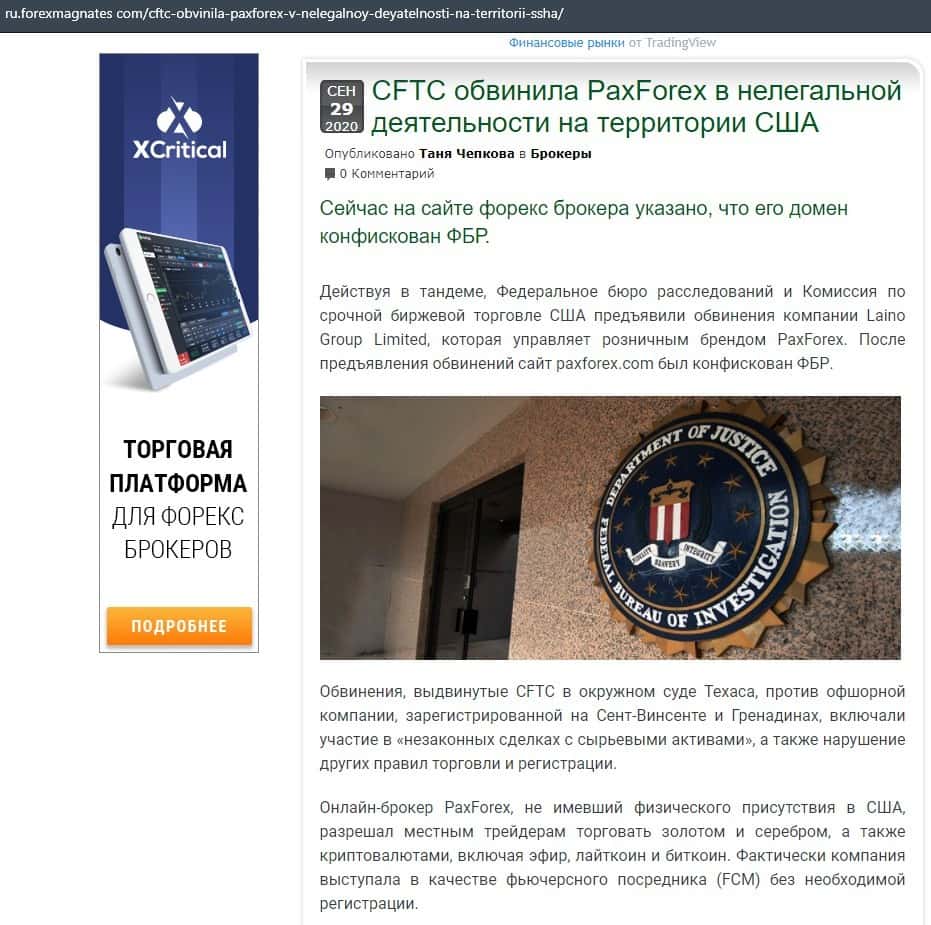 Далее представлена статья где описывается ситуация с конторой PaxForex. Как оказалось ее обвинил американский регулятор CFTC в незаконной деятельности на территории США.