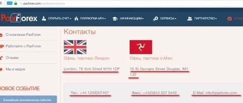 Согласно контактной информации дилингового центра Пакс Форекс, он имеет несколько официальных представительств, а именно в Лондоне, по адресу London, 78 York Street W1H 1DP, и на острове Мэн с адресом 16 St Georges Street Douglas, IM1 1JD. Ниже представлены также номера телефонов и почта, с которой аферисты терроризируют своих потенциальных клиентов: