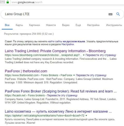 Нам все-таки стало интересно, что за компания эта Laino Group, и мы решили спросить у Google. Поисковик выдал нам несколько сайтов. В основном это сайты, где расположен обзор конторы Пакс Форекс. Но есть еще одна компания с одноименным названием Laino Trading Limited. Это компания не имеет никакого отношения к кухне PaxForex и история с компанией-владельцем на Гренадинах является фарсом.