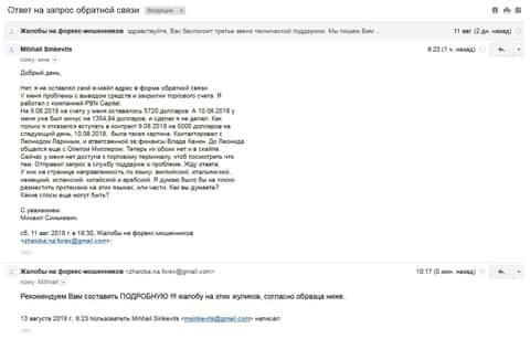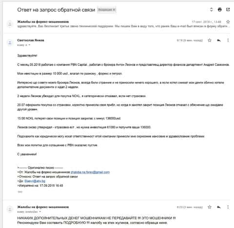 Клиент из Болгарии очень рассердился, когда мошенники ПБН Капитал кинули его на деньги. Он начинал работать с брокером Антоном Леоновым и директором финансовго департамента Андреем Самсоновым. Клиент Вложил 10 000 долларов, так как поддался на их уговоры. Мошенник Леонов убедил жертву обмана открыть сделку и сидеть ждать еще большей прибыли, чем предполагалось. И тут произошел обвал и сделка закрылась в минус 136 000 долларов. Кухня совсем оборзела и аферист сказал, что все в порядке, так как сделка была застрахована. Но не смотря на это просил вложить еще 61 000 долларов, чтобы она сработала в полной мере. Не стоит вестись дальше на этот обман, деньги конечно потеряны большие, но в итоге то мошенники не отдадут ни эти деньги, ни те которые снова вложишь.
