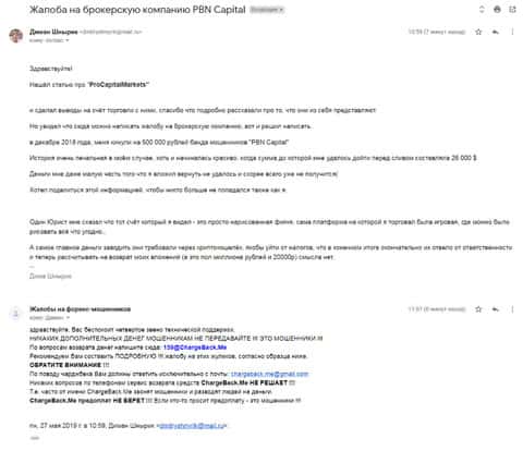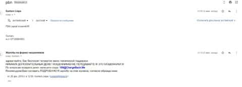 Далее представлено первоначальное письмо, которое прислала жертва кухни ПБН Капитал.