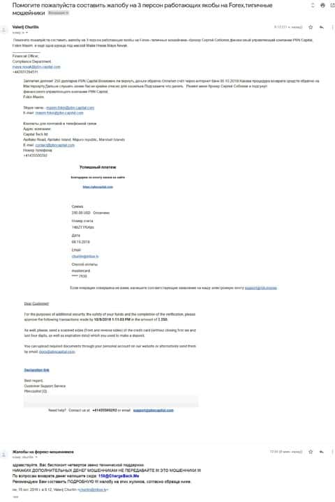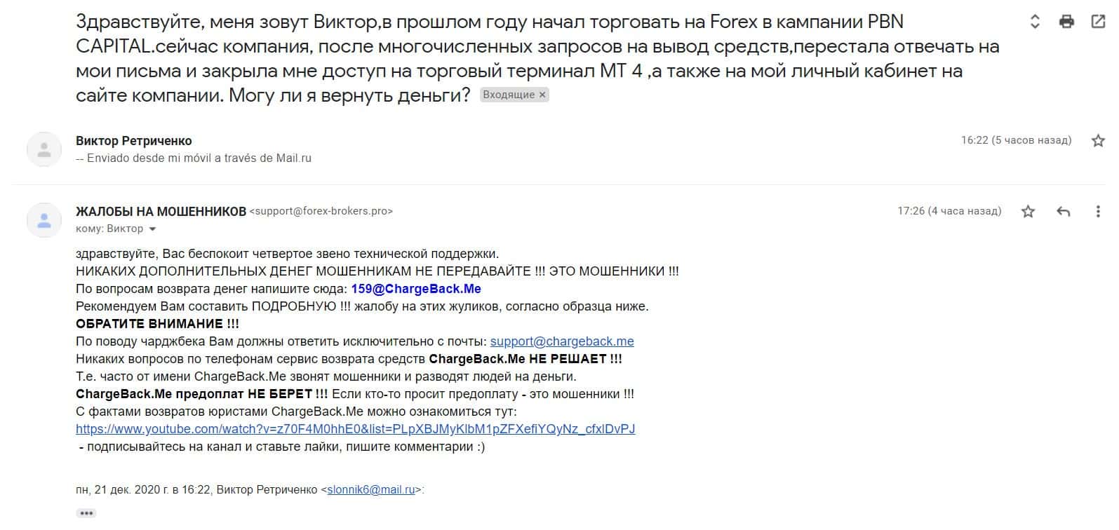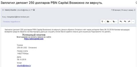 Очередное письмо с просьбой о возврате средств пришло к нам на почту от человека, ставшего жертвой форекс-лохотрона под названием PBN Capital. Жулики Выманивали деньги постепенно, им удалось вытащить у человека порядка 2300 долларов, 7-ю платежами. Благо, что клиент переводил деньги через банковскую карту VISA, есть вероятность, что вложенные средства можно вернуть, правда с небольшими потерями. Но часть лучше чем ничего!