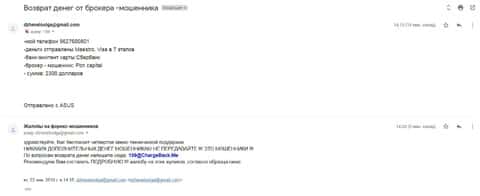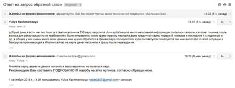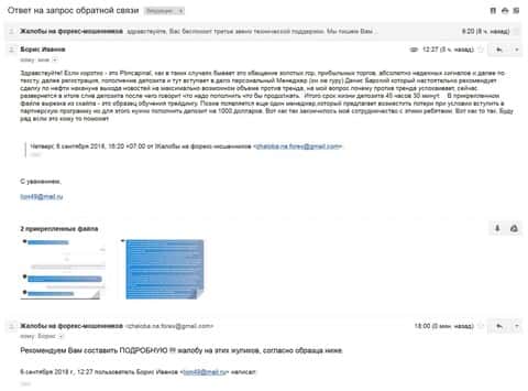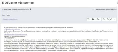 Первое обращение женщины к нам на почту с обращением о мошенничестве ПБН Капитал.