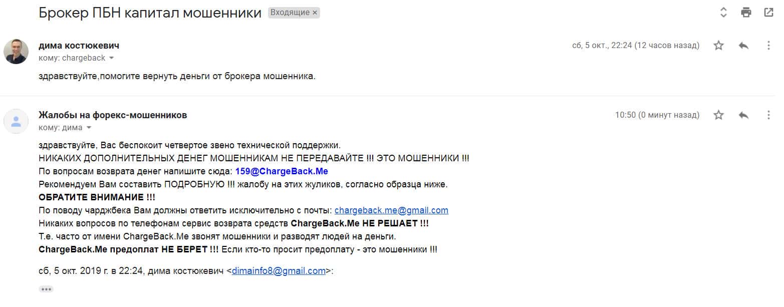 Очередному пострадавшему клиенту кухни ПБН Капитал посоветовали обратится в интернет-службу ChargeBack.Me где возможно ему помогут в возврате утраченных денежных средств на рынке Форекс из-за явно мошеннических действий кухонной организации.