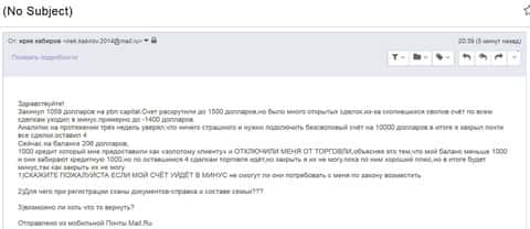 Автор данной жалобы попал на деньги - его развели мошенники из ПБН Капитал. Сначала он закинул 1059 долларов и аналитики подняли сумму счета до 1500 долларов. Но не тут то было, потом ушло все в минус и в итоге осталось 206 долларов. Консультанты аферной организации PBN Capital уверяли клиента, что счет нужно пополнить до 10000 долларов, чтобы перейти на безсвоповый режим. К счастью, жертва обмана отказалась и продолжила торговать. Но доступ к счету заблокировали и оставшиеся сделки невозможно закрыть, а саппорт не отвечает.