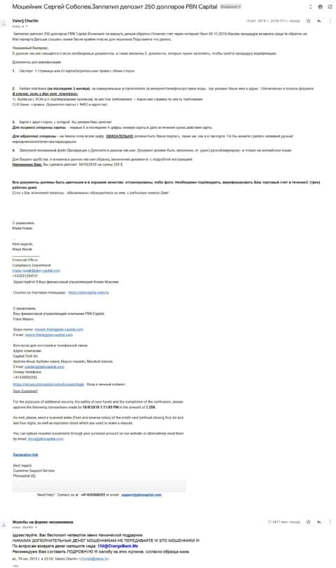 Следующей жертвой ПБН Капиталс стал один честны человек. Он послушал басни мошенников и вложил свои кровно-заработанные 250 долларов. Но после торгов и общения с аферистами он понял, что нужно уносить ноги. Для того чтобы вывести деньги лохотронщики вымогают у клиента пройти верификацию счета и просят предоставить все документы, которые имеются у клиента. Это: паспорт, подтверждение прописки, банковская карта (фото с 2-х сторон). Также подчеркивают, что нужны хорошие скан-копии. Все эти документы можно спокойно использовать в своих аферных делах и взять спокойно займ в любой кредитной организации, а также снять с карты, так как осталось подобрать только 4 цифры пин-кода. Не связывайтесь с мошенниками PBN Capital - вам легче будет.
